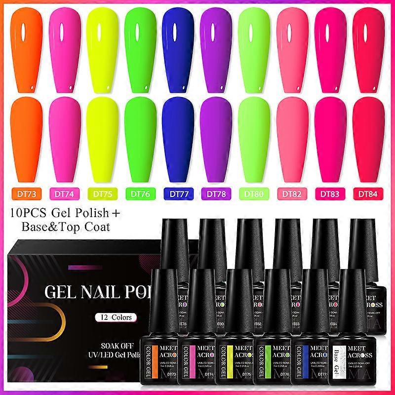 MEET ACROSS 12Pcs/Set 7ml Fluorescent Gel Nail Polish With With Base Top Coat Summer Sparkly Soak Off Nail Art Gel Kit Varnish