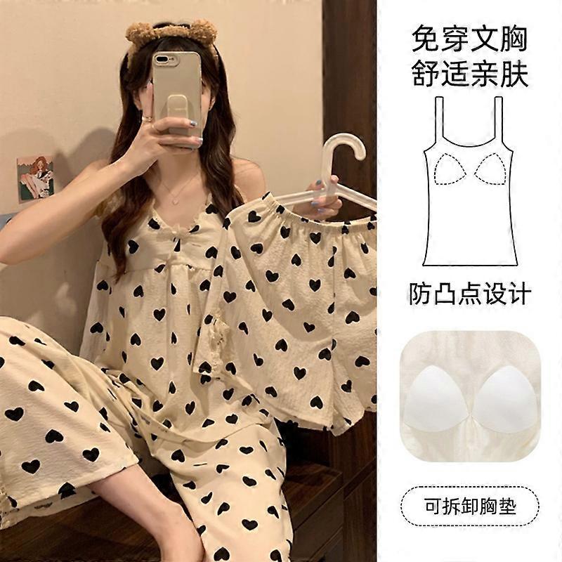 Women's summer pajamas suspenders sexy vest three-piece set with removable chest pads ladies summer home clothes