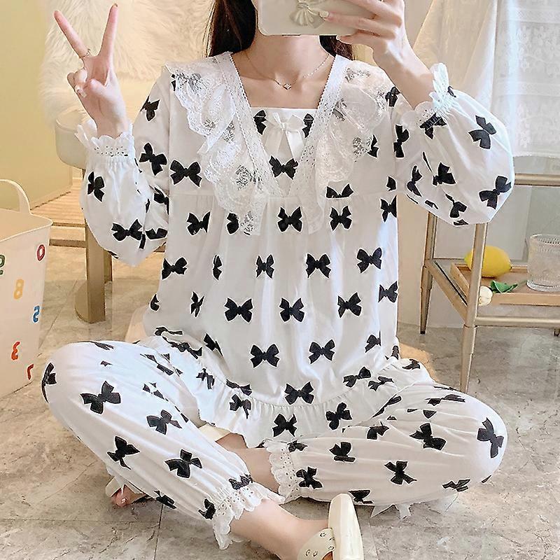 Pajamas women's spring and autumn winter thin cotton long-sleeved lace internet celebrity bow tie outerwear home clothes set