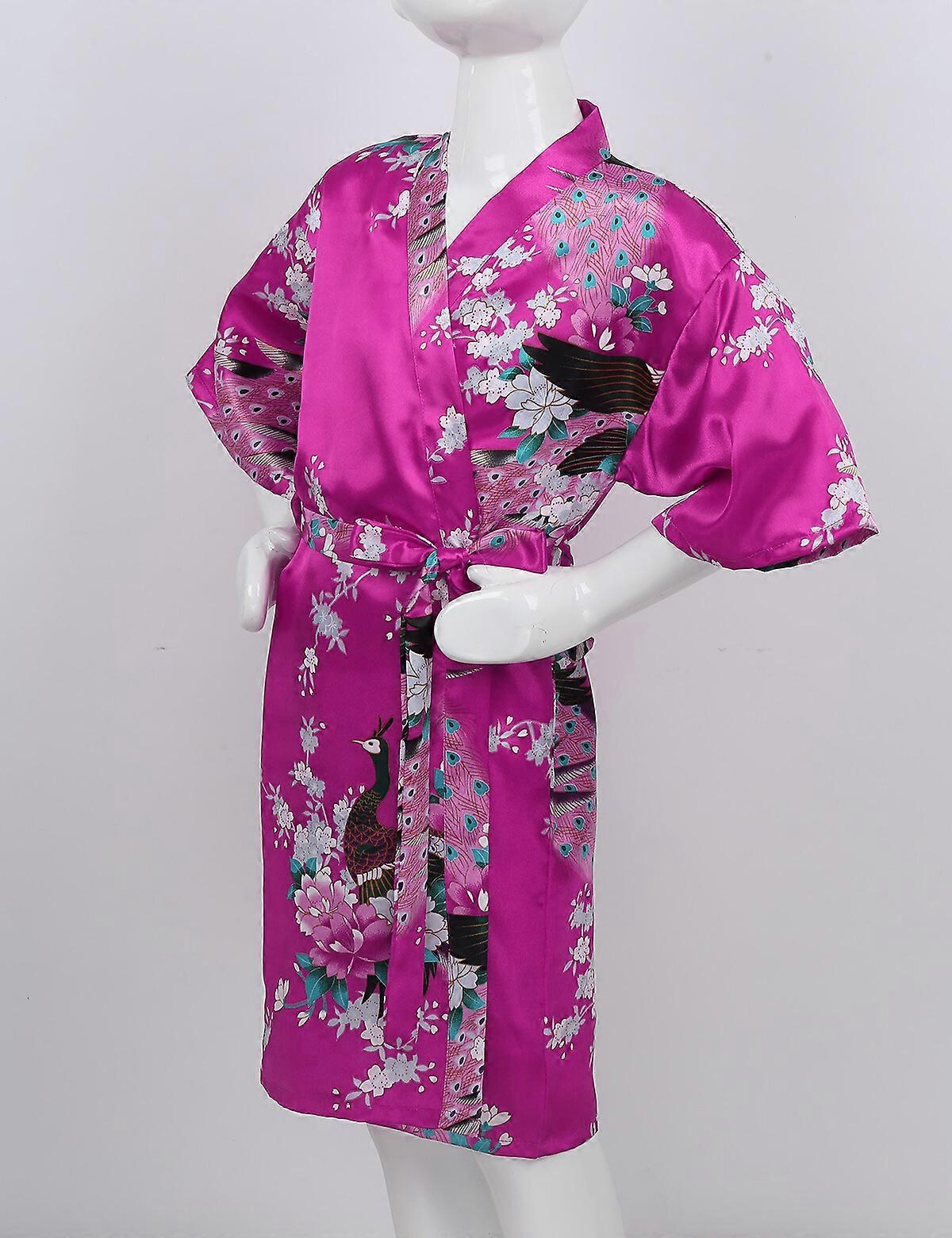 Kids Girls Satin Kimono Bath Robe Nightgown Sleepwear Peacock Printed Pajamas