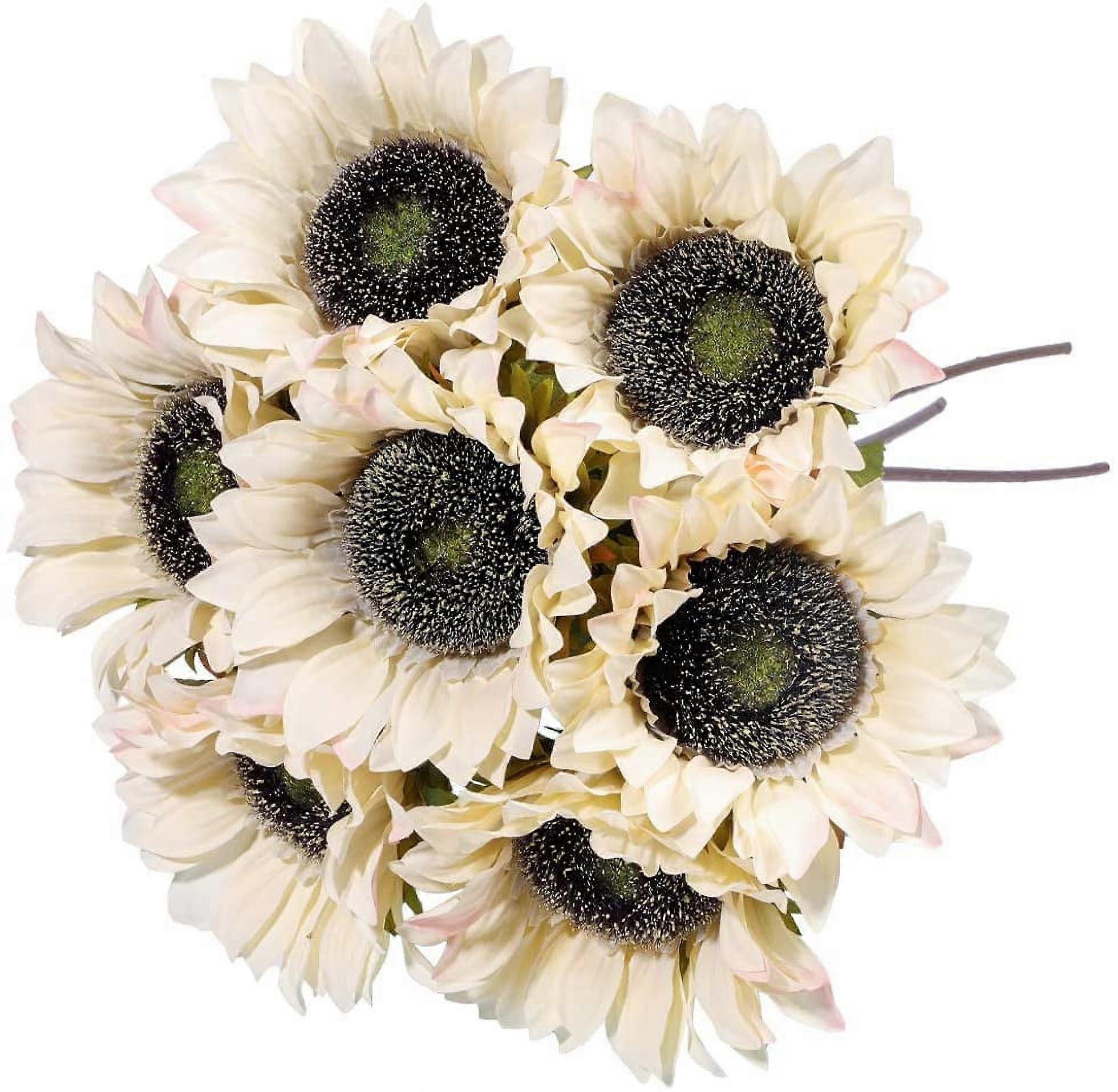 6Pcs Artificial Sunflower Flowers Long Stem Silk Fake Sunflowers Bouquet Decoration for Outdoor Home Wedding Birthday Party, White