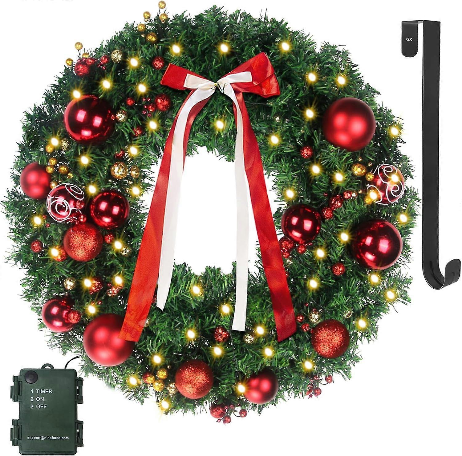 24" Pre-Lit Christmas Wreath with 50 LED, 8 Modes & Timer, Battery Operated, Compatible with Outdoor Decor, Includes Balls & Hanger