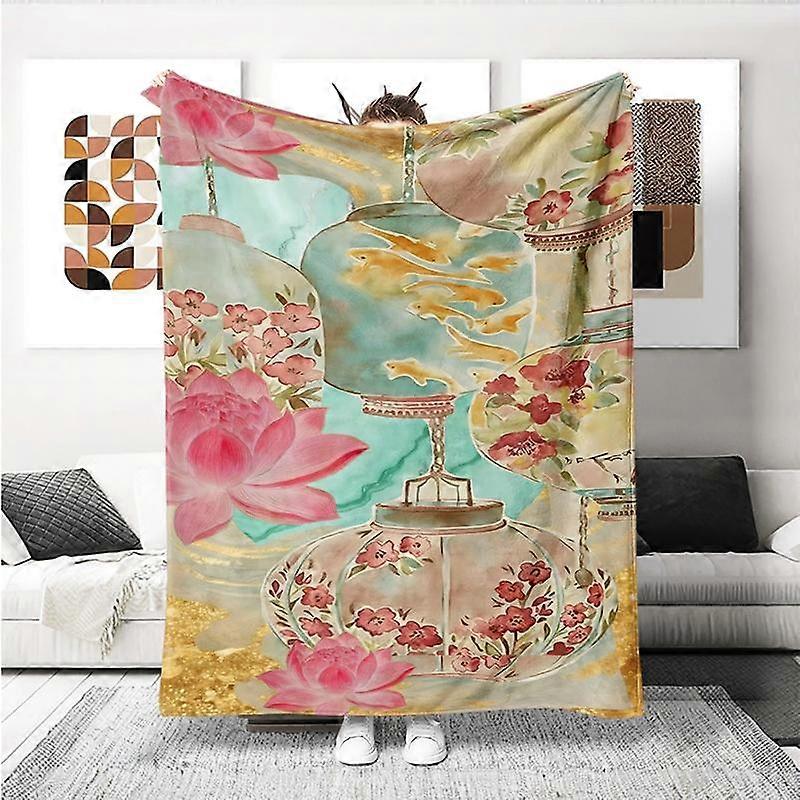 Lotus Lantern Art Throw Blanket, Oriental Watercolor Floral Design, Soft Warm Fleece Cover for Home Decor & Relaxing Moments