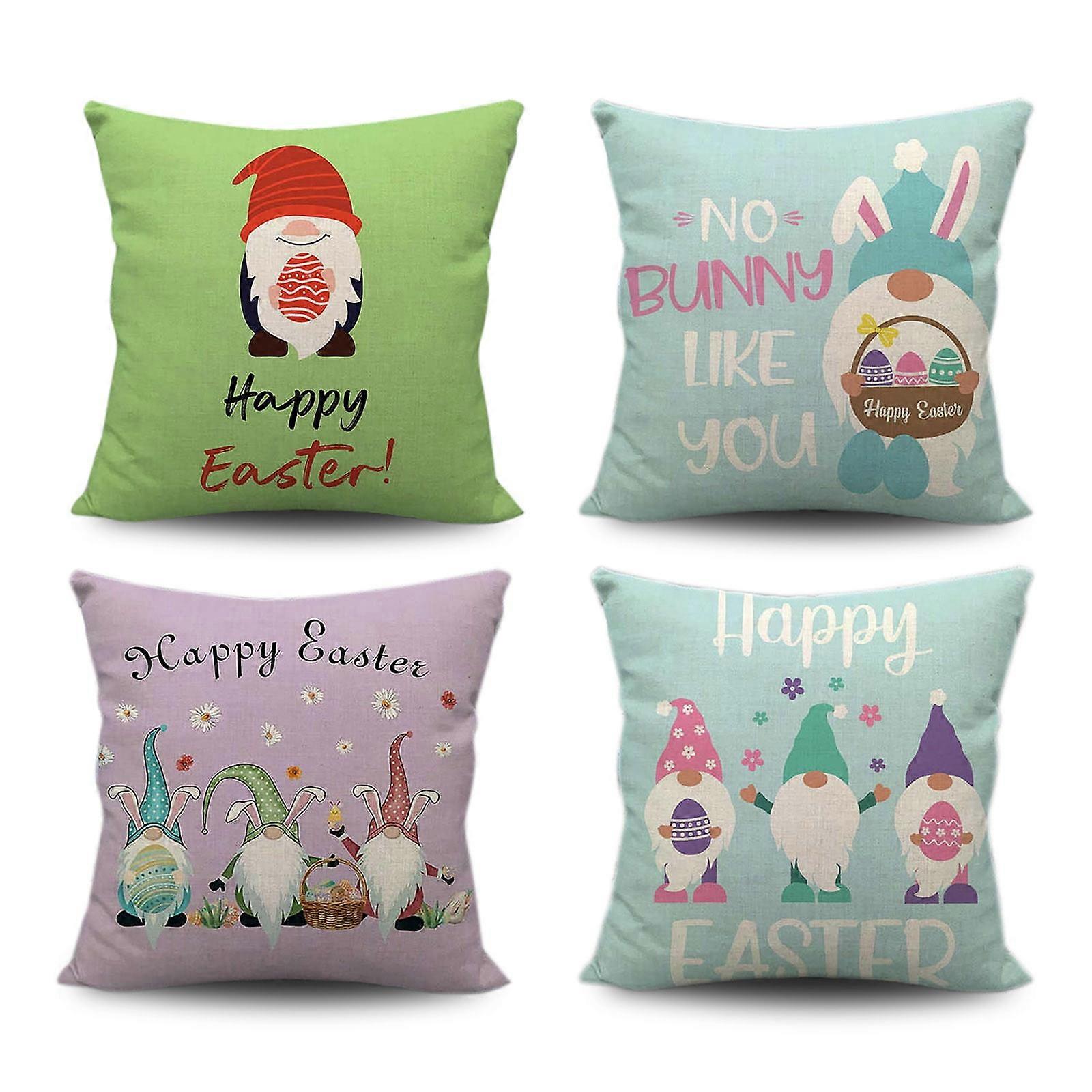 Easter Decorations - 4PC 18x18 Pillow Covers, Happy Rabbit & Eggs Print, Linen Sofa Cushion Case for Indoor Outdoor Home Farmhouse Living Room Decor