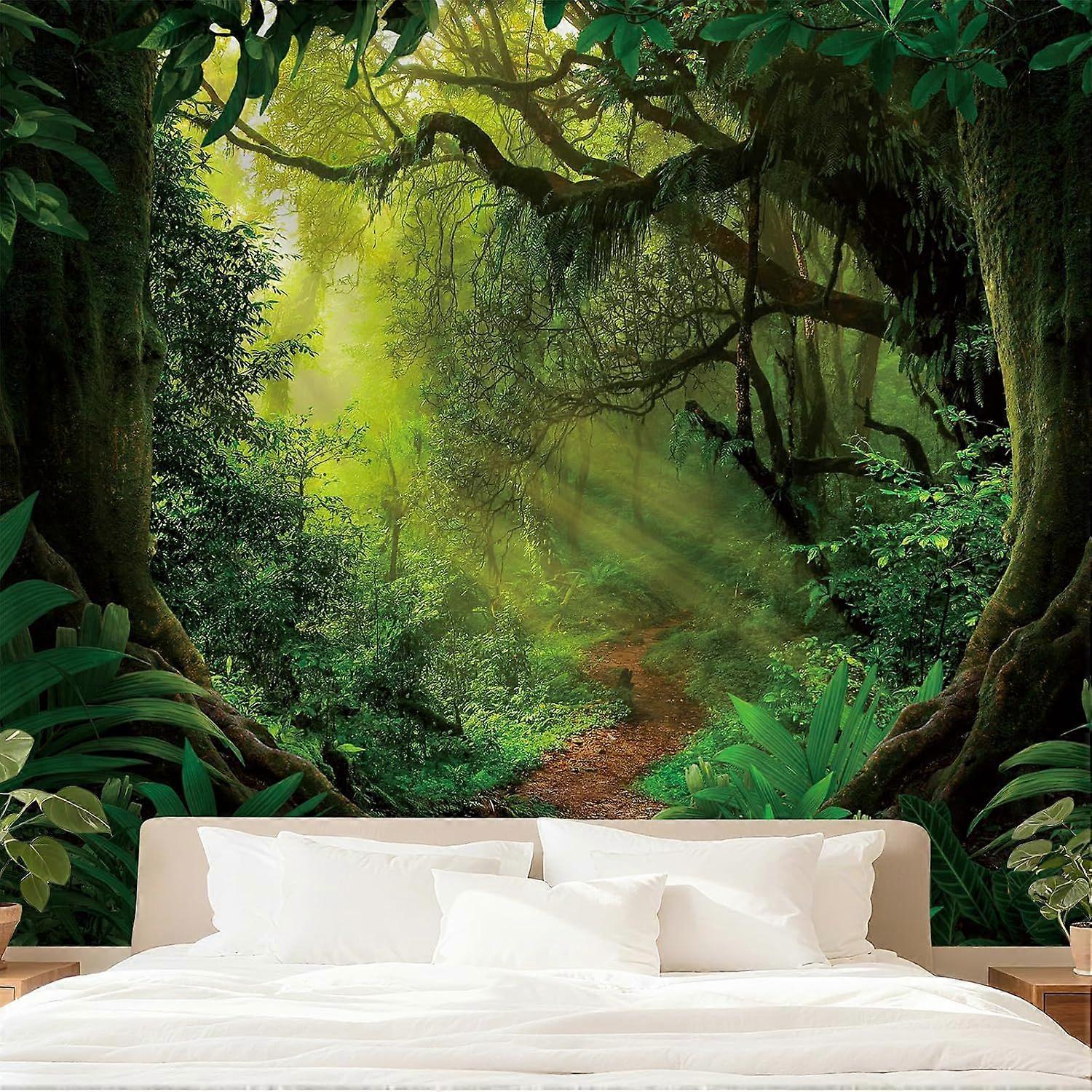 Nature Fort Green Backdrop Wall Hanging Taptry for BedRoom Tropical Jungle Rainfort Tree Wall Mural, Sunbeams Path Nature Scenery Art for Living Room