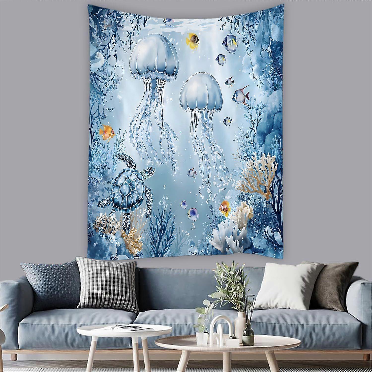 Jellyfish Taptry Nautical Underwater Tropical Sea Turtle Fish Coral Reef Ocean Coastal Watercolor Marine Life TaptriWall Hanging for Bedroom Living Ro