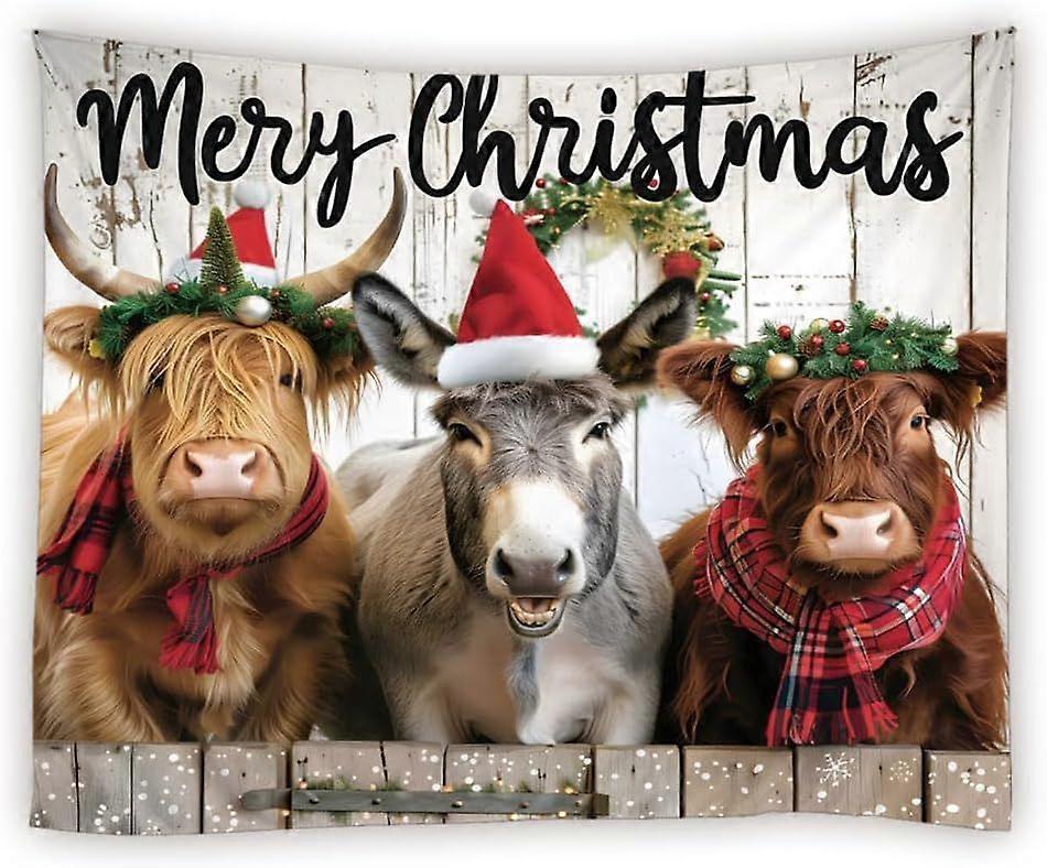 Merry Christmas Taptry Funny Highland Cow Donkey Winter Xmas Wreath Snowflake Rustic Wooden Board Animal Holiday TaptriWall Hanging for Bedroom Living