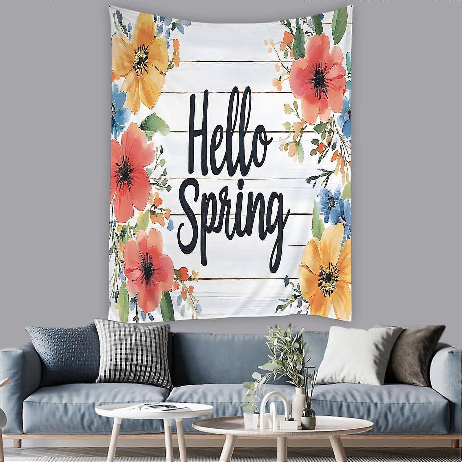 Watercolor Floral Taptry Orange Red Flower Green LeavHello Spring Garden Scenery Rustic Wooden Board Wildflower TaptriWall Hanging for Bedroom Living