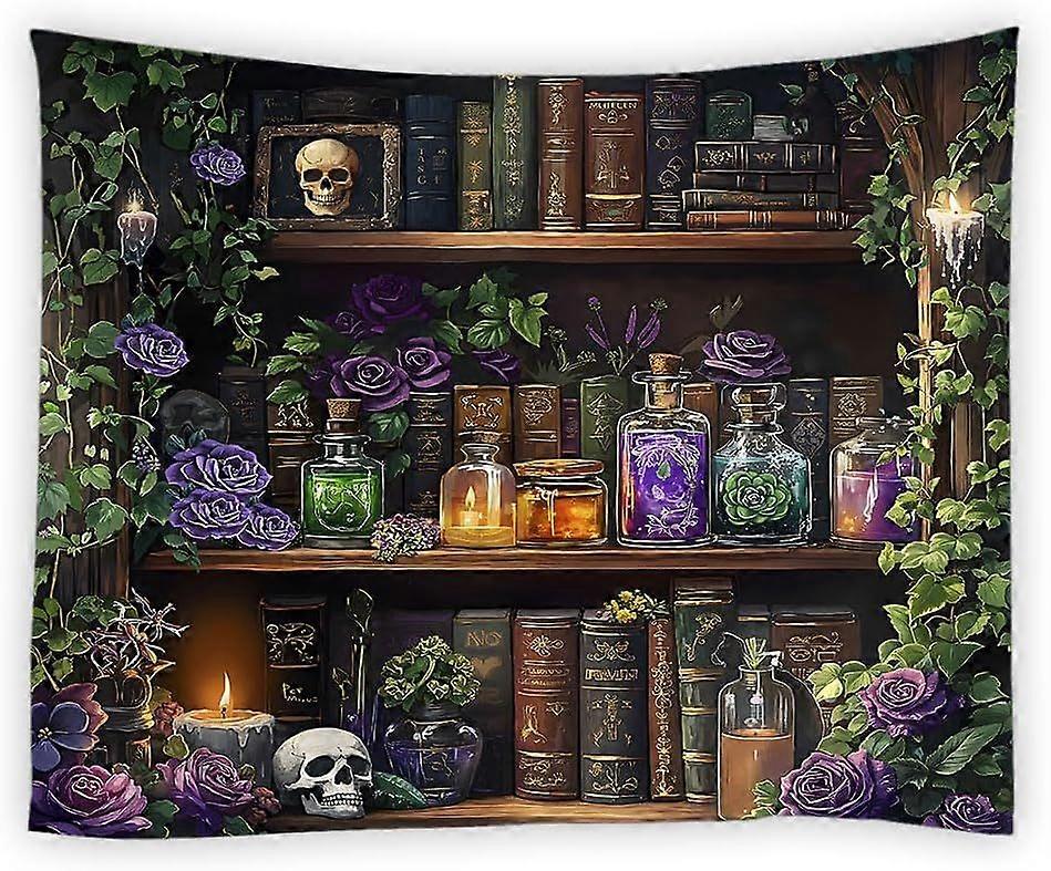 Gothic Bookshelf Taptry Spooky Skull Magic Wizard Bookcase Purple Rose Floral Bottle Green Vine Plant Mysterious TaptriWall Hanging for Bedroom Living