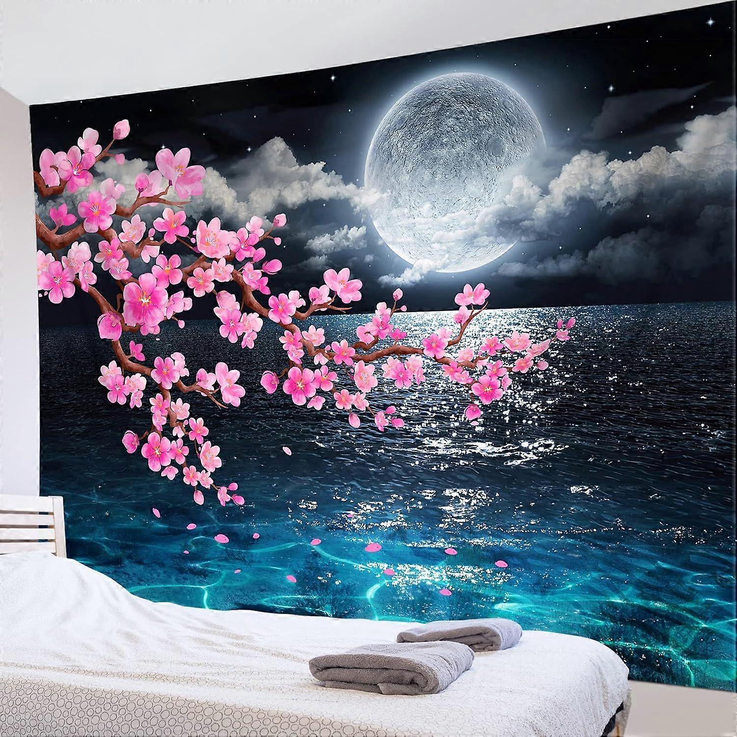 Full Moon over Ocean Taptry Japane Pink Cherry Blossom Taptry for Bedroom Psychedelic Teal Decor Wall Hanging Taptry Fantasy Wall Art for Living Room