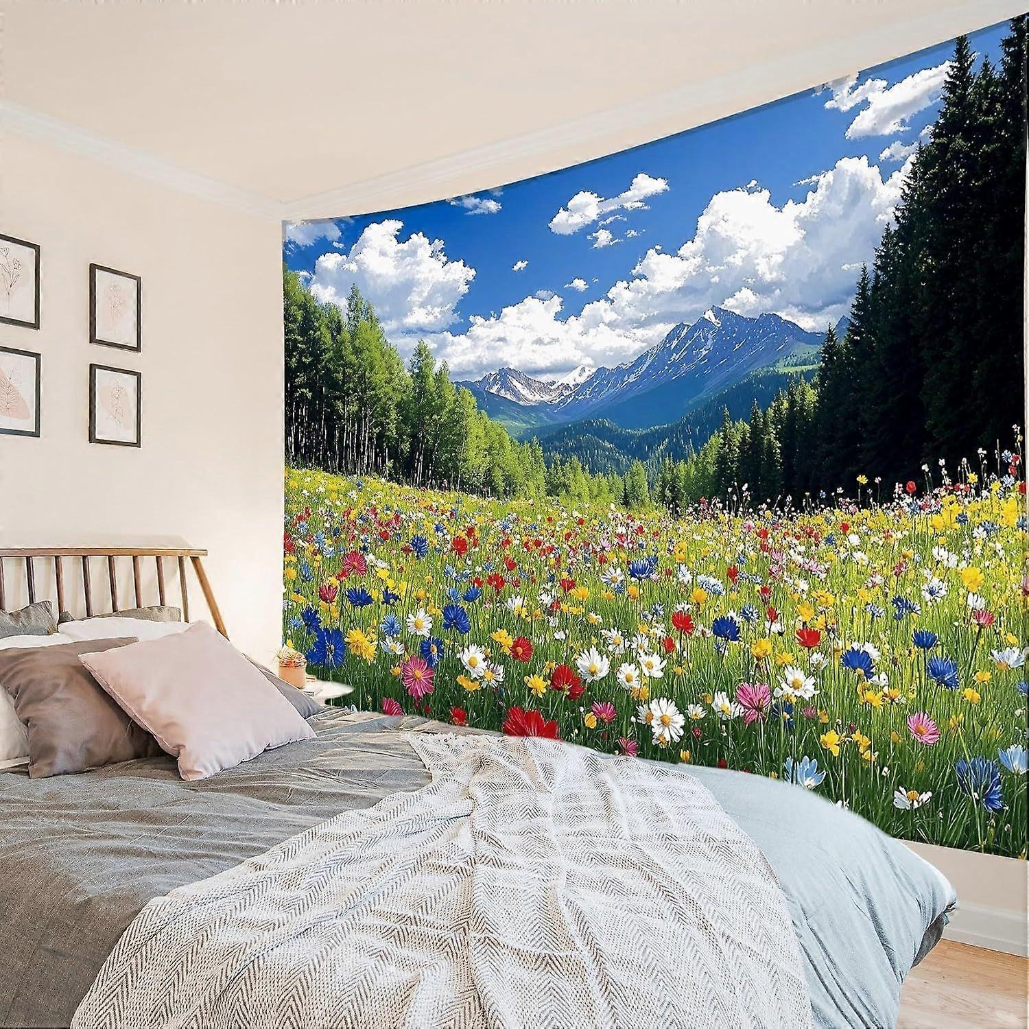 Nature Mountain Floral Wall Taptry for Living Room Colorful Flower Daisy and White Cloud Taptry Wall Hanging Modern Athetic Art Decor for Bedroom Dorm