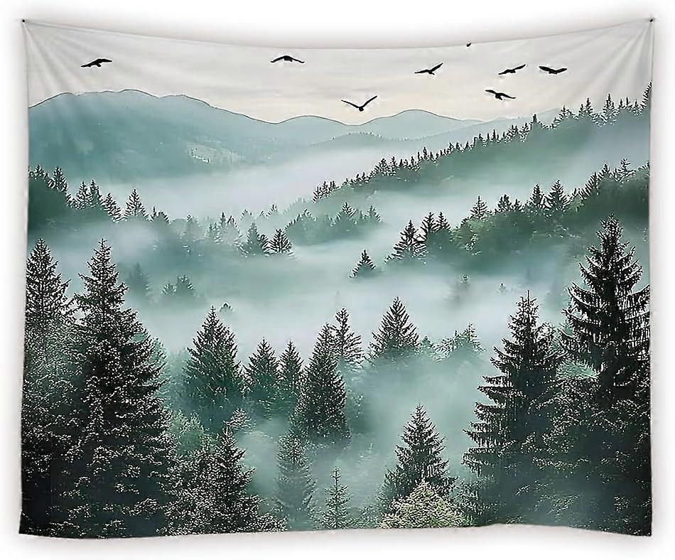 Misty Fort Mountain Taptry Foggy Smokey Green Pine Tree Birds Rustic Nature Scenery Watercolor Landscape TaptriWall Hanging for Bedroom Living Room Do