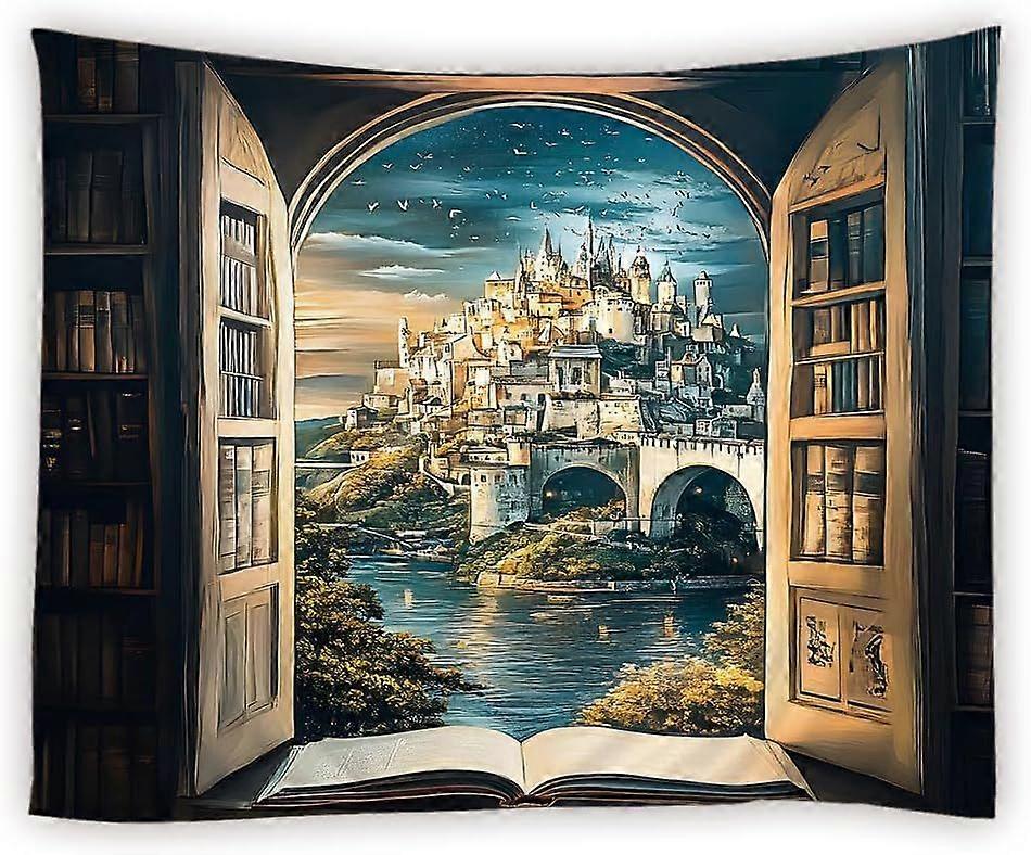Fantasy Library Bookshelf Taptry Wooden Window Castle Mountain Lake Educational Bookcase Wonderland Landscape TaptriWall Hanging for Bedroom Living Ro