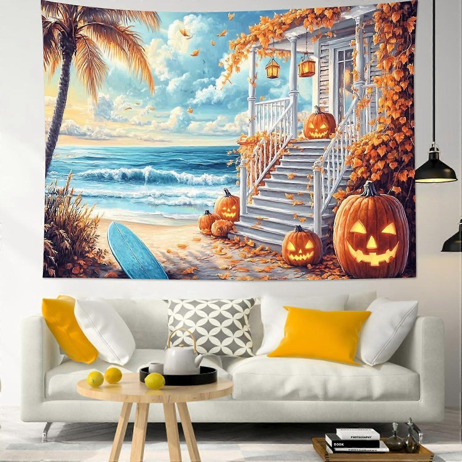 Fall Beach Taptry, Autumn Orange Pumpkin with Blue Coastal Ocean Wall Taptry for BedRoom Fall Maple Leaf Wall Art for Living Room Dorm Home Decor Read