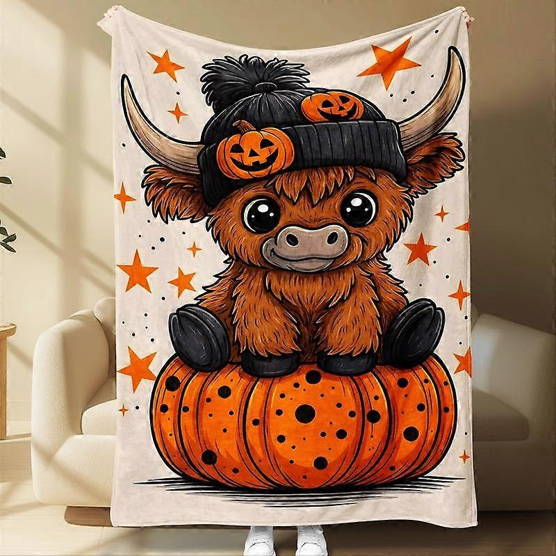 Cute Highland Cow on Pumpkin Throw Blanket, Halloween Pumpkin Star Design Fleece Blanket, Cozy Blanket for Fall and Holiday Decor
