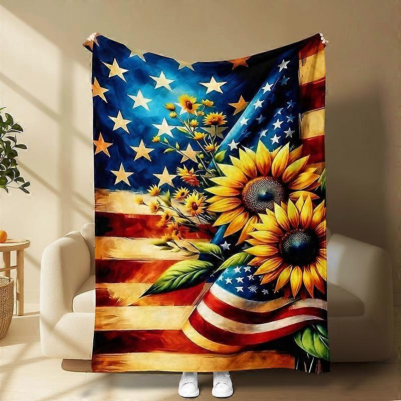 Flannel Blanket with Star Spangled Banner & Sunflower Design, Soft Texture, Perfect for Living Room Bedroom Office Daily Use