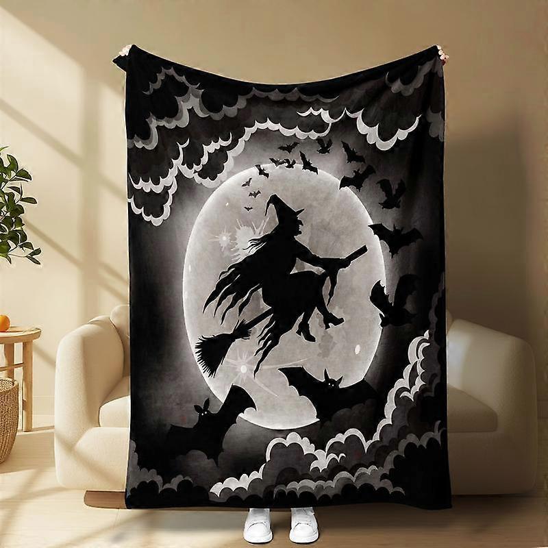 Ultra-Soft Halloween Flannel Blanket, Witch Broom Moon Cloud Bat Design, Dark Tone, Cozy Bedroom Decor, Holiday Gift Idea