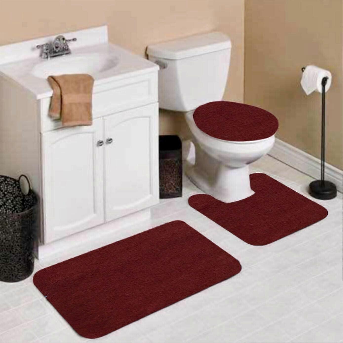 3-Piece Burgundy Bath Mat Set: Contour Mat, Toilet Lid Cover & Bath Mat - Ultra Absorbent, Anti-Slip, Chenille Soft