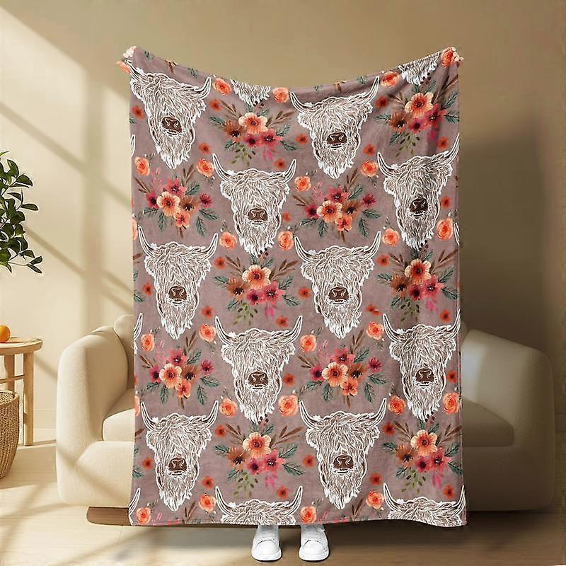 Flannel Blanket with Highland Cow & Floral Patterns, Cozy Throw for Living Room Bedroom Office Daily Use, Perfect Gift Idea
