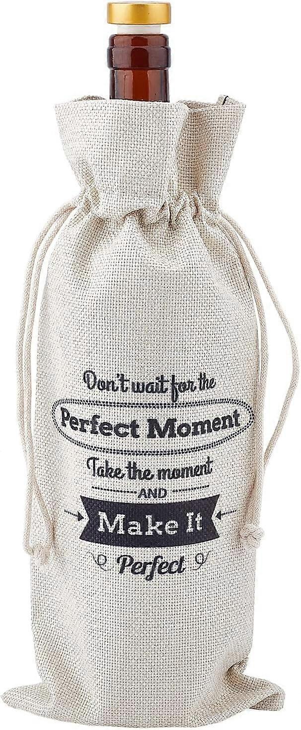 Cotton Wine Gift Bag Don't Wait For The Perfect Moment Take The Moment And Make It Perfect Bags [DON'T WAIT FOR THE PERFECT MOMENT TAKE THE MOMENT AND MAKE IT PERFECT]: The bottle bag is printed with motivational words to remind you to seize the moment, don't wait all the time, use your own power to create the perfect moment. [FITS MOST WINE BOTTLES]: 1pc wine bottle gift bag, size: 13.39 inch H x 5.91 inch W (34cm x 15 ), thickness:0.2inch(5mm).Fit all standard size wine bottles and 750ml wine bottle. [DURABLE MATERIAL]: This wine bag is made of high-quality cotton linen and has a reinforced bottom, sturdy and durable, and the pattern printing does not fade. [DRAWSTRING WIN BAG]: The cotton wine bottle bags are designed with drawstrings, which makes the bags easy to close and open, convenient for storage wine bottle or other things. [WIDE APPLICATION]: Suitable for family, friends, teachers, bosses, clients, husbands and wives as Christmas, Halloween, Father's Day, Mother's Day, Birthday, Wedding, Wedding Anniversary, Housewarming Party, Red Wine Packaging Gifts.