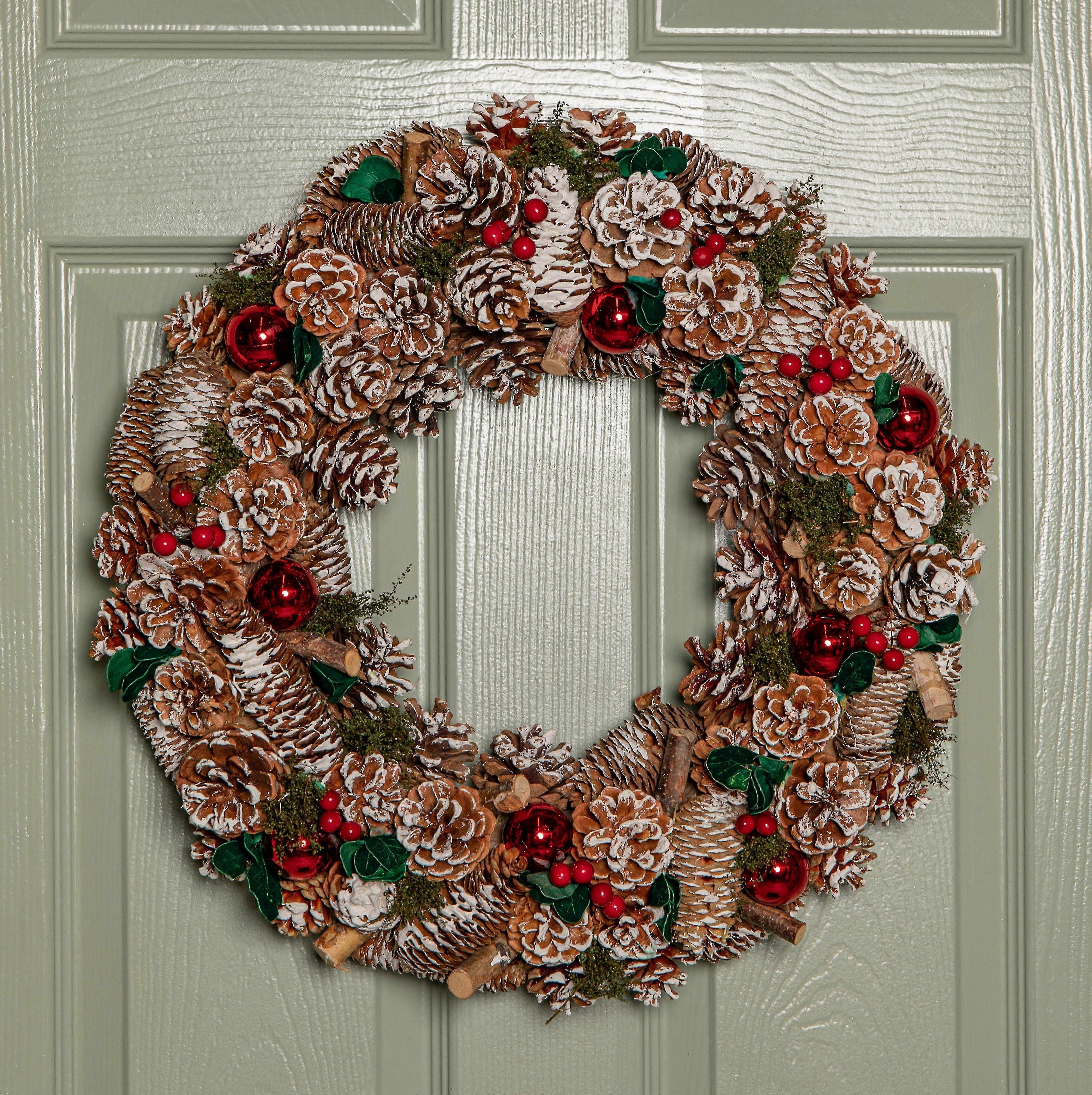 50Cm Hanging Christmas Yulefest Wreath With Red Baubles & Snow Tipped Pine Cones
