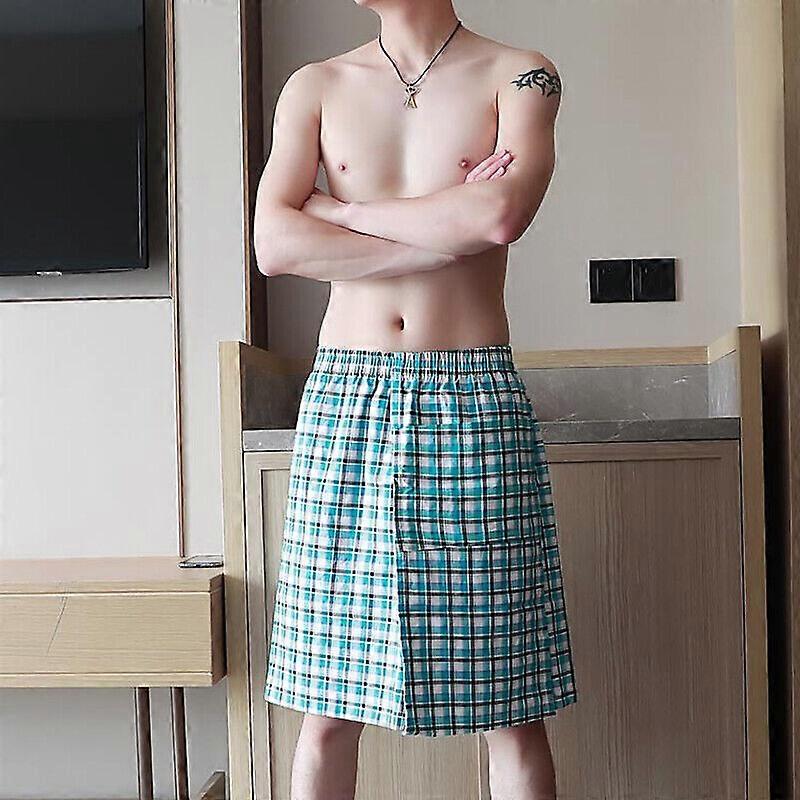 Men's Plaid Skirt Pajamas Sleep Bottoms Breathable Tartan Bath Skirt w/ Pocket