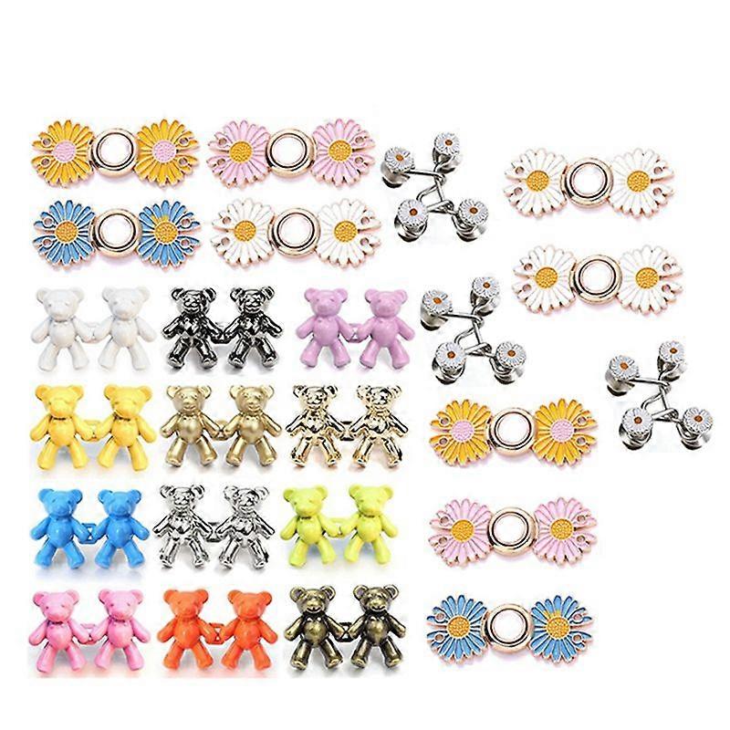 [Good Material]The bear pants clip is made of high-quality metal, which is and not not easy to get deformed. They not bend or crack under finger pressure. [Easy to Use]Unique button slot design, not fall off when stuck to make easy to use and effective fasteners for any sewing project. Good waist tightener clip for loose jeans. [Firmly Fixed]This bear jeans buttons make your waist belt can be changed small, bear waist clips is detachable, and the adjustment is firm, tool free, removable and reusable. [Widely Use]This bear waist tightener can be used for jeans, skirts, jackets, coats, shirts, bags, pants, overalls, suspender trousers and shorts. Color: As Shown Material: alloy Package Contents: 12 pairs of bear buttons 9 pairs of flower buttons 3 pairs of style buckles Only the above package content, other products are not included. Note: Light reflection and different displays may cause the color of the item in the picture a little different from the real thing. The measurement allowed error is +/- 1-3cm.