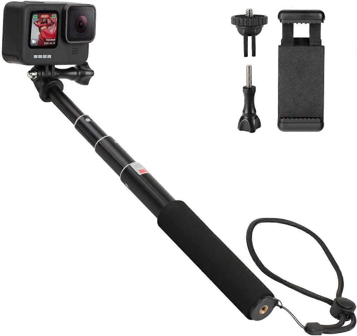 Telescoping Selfie Stick – Allows quick length adjustments from 7.9"to 22.6". Comfortable contact surface with silicone grip High Quality Waterproof and Rustproof Material – The handheld monopod is made of waterproof & rustproof aluminum which makes the stick exquisite enough and stable enough to support your action cameras, allow you enjoy all water sports Ensure your GoPro Safety – This gopro selfie stick has slip resistant rubber and wrist strap around the pole handle to prevent unexpected falling off Compatible with – GoPro Hero 10/9/8/7/6/5/4/3/2/GoPro Hero (2018)/ Hero Fusion, also compatible for compatible with iPhone 12/11/10/9 Plus/X/8/8Plus/7/7Plus/6s/Galaxy S9/S9 Plus/Note 8/S8, AKASO Brave 7/6/4 EK7000 V50 V50X Campark Dragon Touch REMALI 4K and other action cameras and cell phone mobiles Set Contents –1 x selfe stick, 1 x cell phone holder, 1 x tripod mount, 1 x thumbscrew, 1 x wrist strap