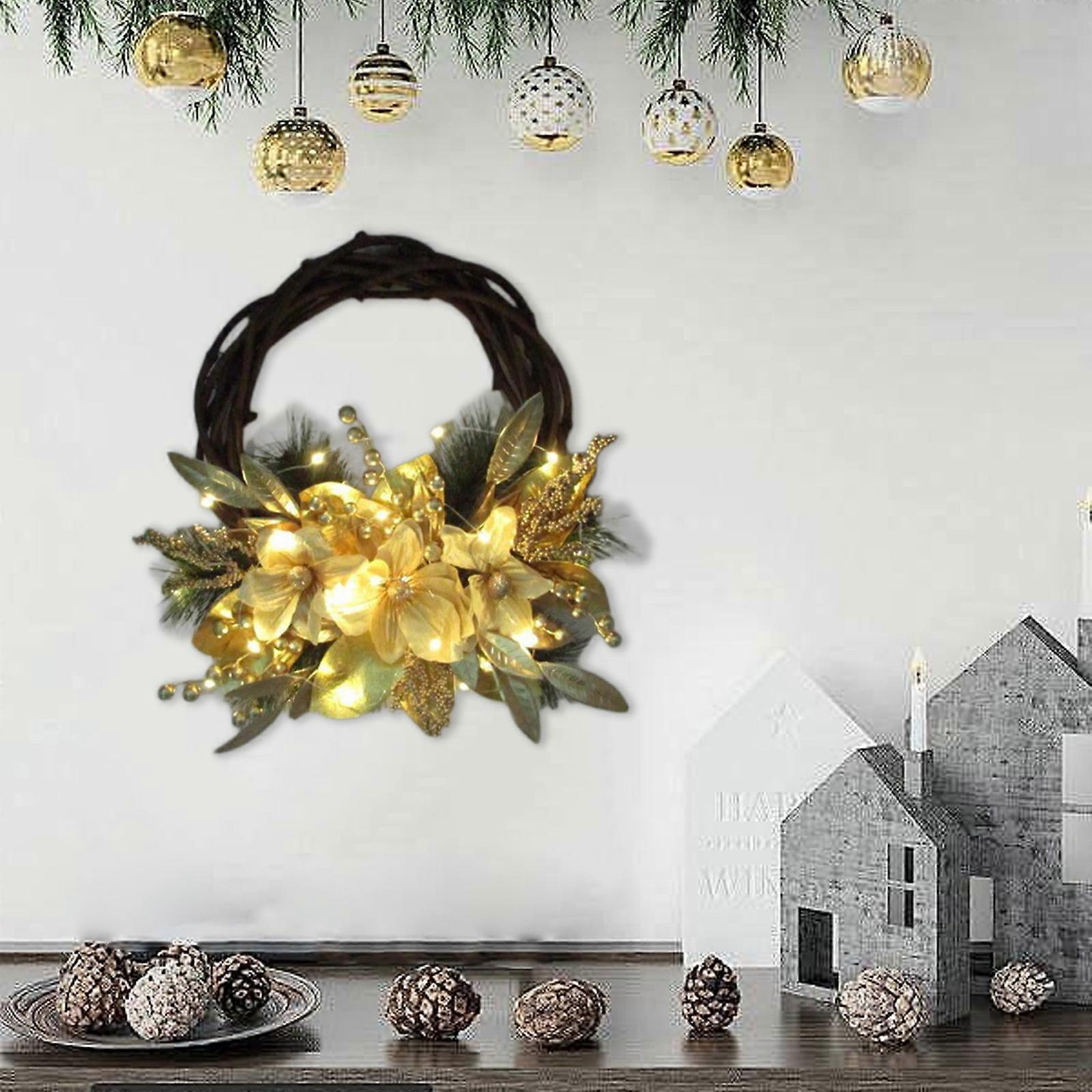 Luminous Christmas Wreath Rattan Door Hanging Half Tree Christmas Window Decoration Rattan Door Hanging Feature: Quantity: 1 pc Material:plastic Color: Gold Product size: 40x40cm /15.7x15.7in Packing size:38x38x5cm /14.9x14.9x1.9in Net weight:430g/0.9lb Gross weight:450g/0.9lb Product Standards:1x wreath,1xLight String Charge:You need to bring two AA batteries Descrition: Well quality materials: Our light up Christmas garland is carefully crafted using premium materials, ensuring durability and Sturdy . The use of well quality materials guarantees a beautiful and long lasting decoration for your festive celebrations. Eye catching design: Designed with great attention to detail, our Christmas garland features a unique half tree shape that adds a feel of beautiful to any space. Its lively colors and sparkling lights create a captivating display that will impress your guests. Create a festive ambiance: With its ability to emission a gentle Light , our light up Christmas garland instantly sets the mood for the holiday season. Whether used as a door hanging or window decoration, it creates a warm and inviting surrounding feeling that captures the spirit of Christmas. Versatile decoration: This decorative garland can be easily hung on doors, Window , mantels, or walls, adding a festive feel to any area of your home. Its flexible nature allows for easy shaping and positioning, ensuring a good suit in any space. Good for Christmas decor: Our light up Christmas garland is specifically designed to enhance your holiday decorations. Its combination of excellent craftsmanship and enchanting design makes it an ideal choice for adding that extra festive feel to your home during the Christmas season. Package Content: 1x wreath 1xLight String 【Charming Design】 Delicate craftsmanship brings a festive spirit to any space, with intricate details that capture the essence of the holiday season. 【Versatile Use】 Perfect for adorning your tree, mantle, or dining table, these decorations effortlessly enhance your holiday décor, making every corner feel merry. 【Durable Material】 Made from high-quality materials, these decorations are designed to withstand the test of time, ensuring they can be cherished year after year. 【Easy to Hang】 Featuring user-friendly designs, these ornaments can be easily hung or placed, allowing you to create a beautiful holiday display with minimal effort. 【Thoughtful Gift Option】 Ideal for gifting, these decorations make a wonderful surprise for friends and family, adding a touch of joy and warmth to their celebrations.