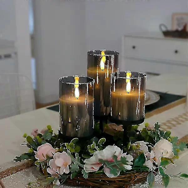 Glass LED lights, battery operated lights, pillar lights battery operated with remote control and timer, electric lights, wax+grey glass, set of