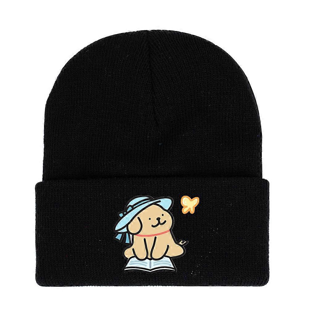 Maltese Line Puppy Autumn And Winter Dopamine Knit Hat, Fashionable Solid Color Printed Knit Beanie For Men And Women-Black~2