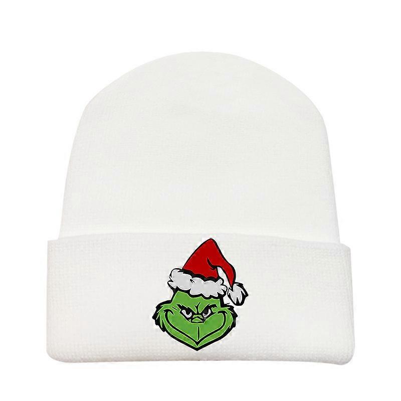 Christmas Grinch New Autumn And Winter Anti-Freeze Warming Hat, Printed Green Grinch Hat, Fleece Knitted Hat-White-C