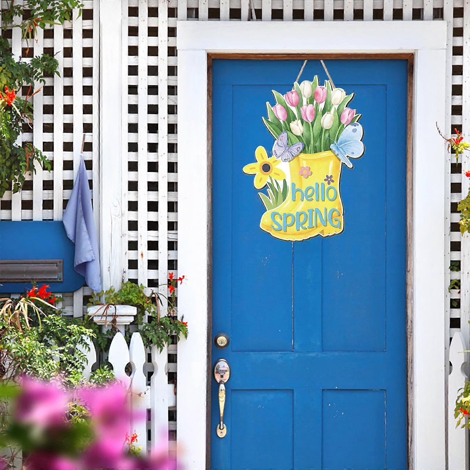 Colorful Flowers Spring Welcome Sign - Wooden Door Plate, Hanging Decorative Panel for Porch Entrance