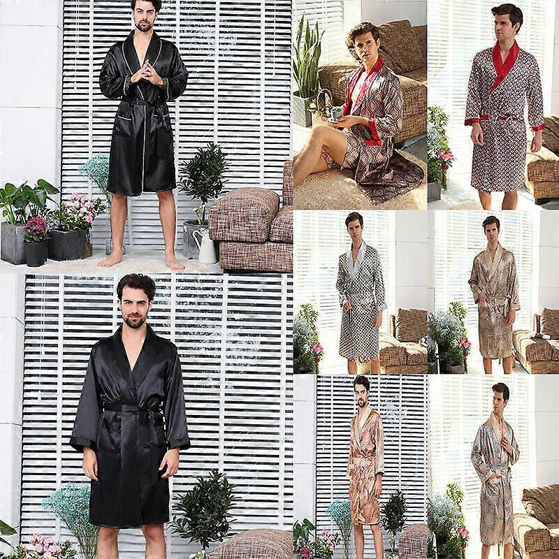 Mens Satin Silk Summer Pajamas Kimono Bathrobe Robe Dressing Gown Loungewear