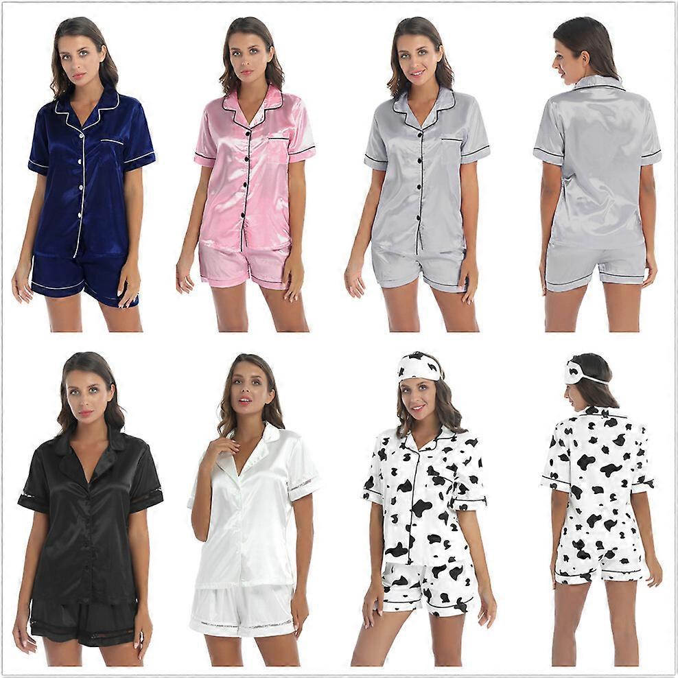 Women Silky Satin Pajamas Set Short Sleeve Shirt Top Shorts Sleepwear Loungewear