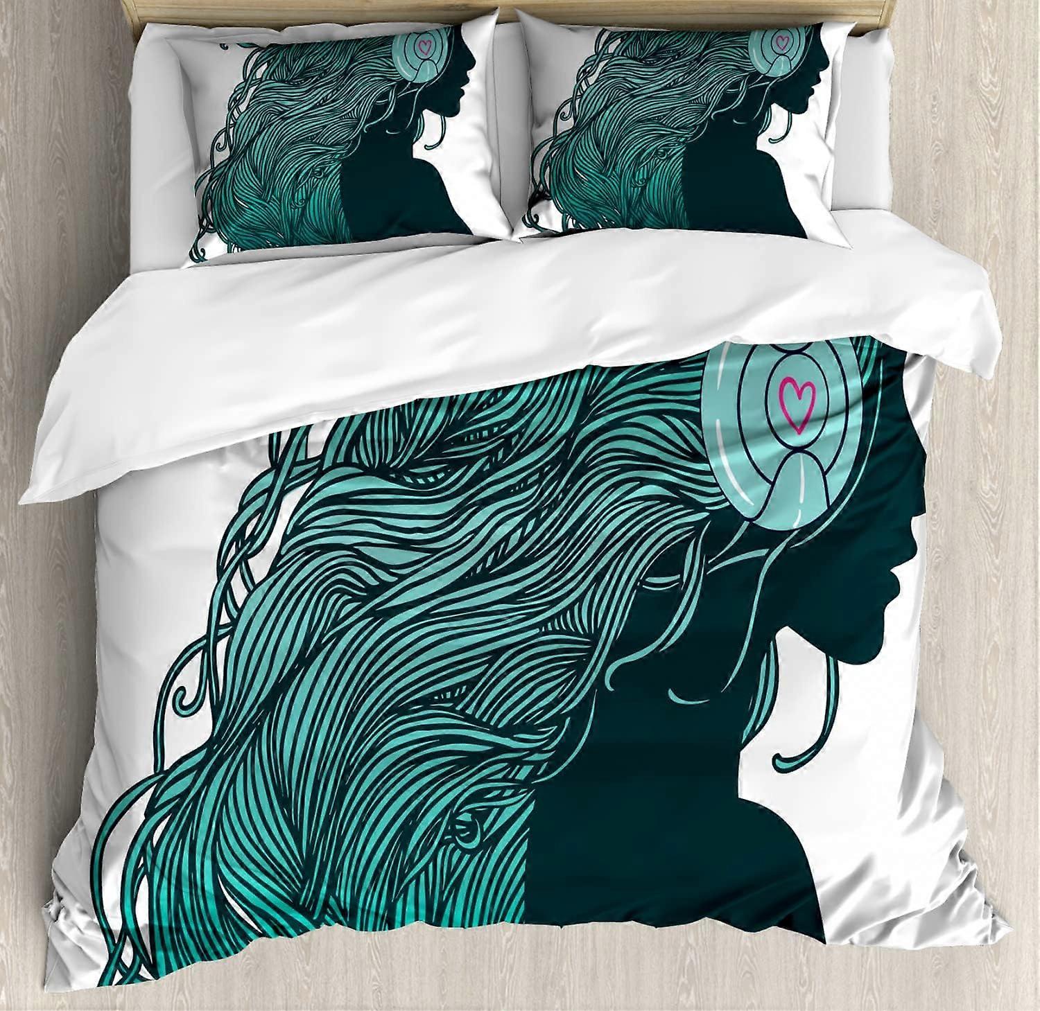 Music Duvet Cover, DJ Girl Profile Hair in Headphones Nightclub Silhouettes Party Print, Decorative 3 Pcs Bedding Set with 2 Pillowcases, White Teal