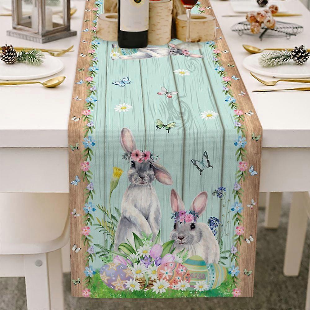Easter Table Runner 13x70in, Rustic Truck Wood Cotton Linen, Blue Stripes Bunny Eggs, Farmhouse Style, compatible with Spring Wedding Party Dinning