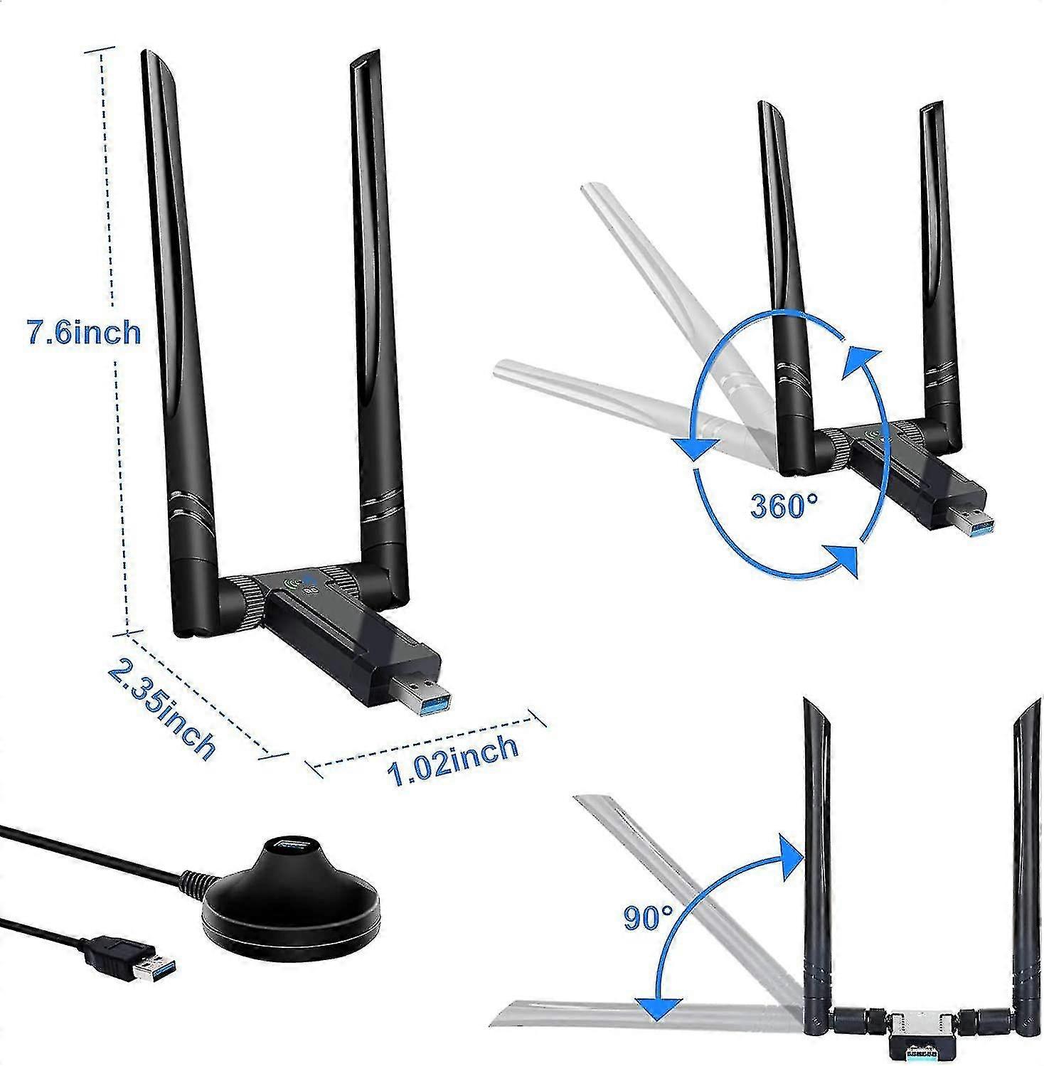 ULTIMATE WIRELESS ARE This wireless USB adapter comes with 2 pieces WiFi antennas with a long range of 5dBi. This WiFi adapter ensures an extended WiFi connection and superior stability on your desktop, laptop, PC. Angle-adjustable, the Wi-Fi antenna for better signal reception: you can adjust the angle of the external Wi-Fi antenna horizontally and vertically to get the best Wi-Fi connection at your location.EXCELLENT WI-FI SPEED Upgrades PCs to 802.11ac with ultra-fast wireless AC1200 adapter speed. You can reach a wireless speed of 867 Mbps in the 5.8 GHz Wi-Fi band or a speed of 300 Mbps in the 2.4 GHz Wi-Fi band for online games and seamless HD video streaming and computer games.Easy installation with the USB 3.0 socket, our USB 3.0 socket can be easily connected to computers or other devices compared to competitors. They are ten times faster than 2.0 and there are no complicated tasks to install. Compatible with USB 2.0 and 1.1 devices.WIFI Hotspot With the Soft-AP function, you can create a hotspot if your computer has a wired Internet connection. You can transfer Wi-Fi from your computer to your mobile devices.UNIVERSAL COMPATIBILITY Works with any Wi-Fi router Supports Windows 10 - 7 or Vista or XP, MAC, Linx.Specification:Interface: USB 3.0Antenna: 5 dBi long range high gain antenna.Frequency range: 2.4 GHz - 2.4835 GHz 5.12 GHz - 5.825 GHzModulation type: OFDM or CCK or 16-QAM or 64-QAMSupport system: Windows XP or Vista or Win7 or Win8 or Win10 or Mac OS or Linx.Standards: 802.11ac, backwards compatible with 802.11 a or b or g or n products for wireless standardsInstallation:1. Insert the CD into the PC (do not connect the Wi-Fi adapter first)2. Open the " Setup.exe "on the CD and install the driver3. Restart your computer after installing the drivers and insert the Wi-Fi adapterPackage includes:1 x WiFi adapter1 x 30 inch wire adapter stand.1 x CD driver1 x user manual.