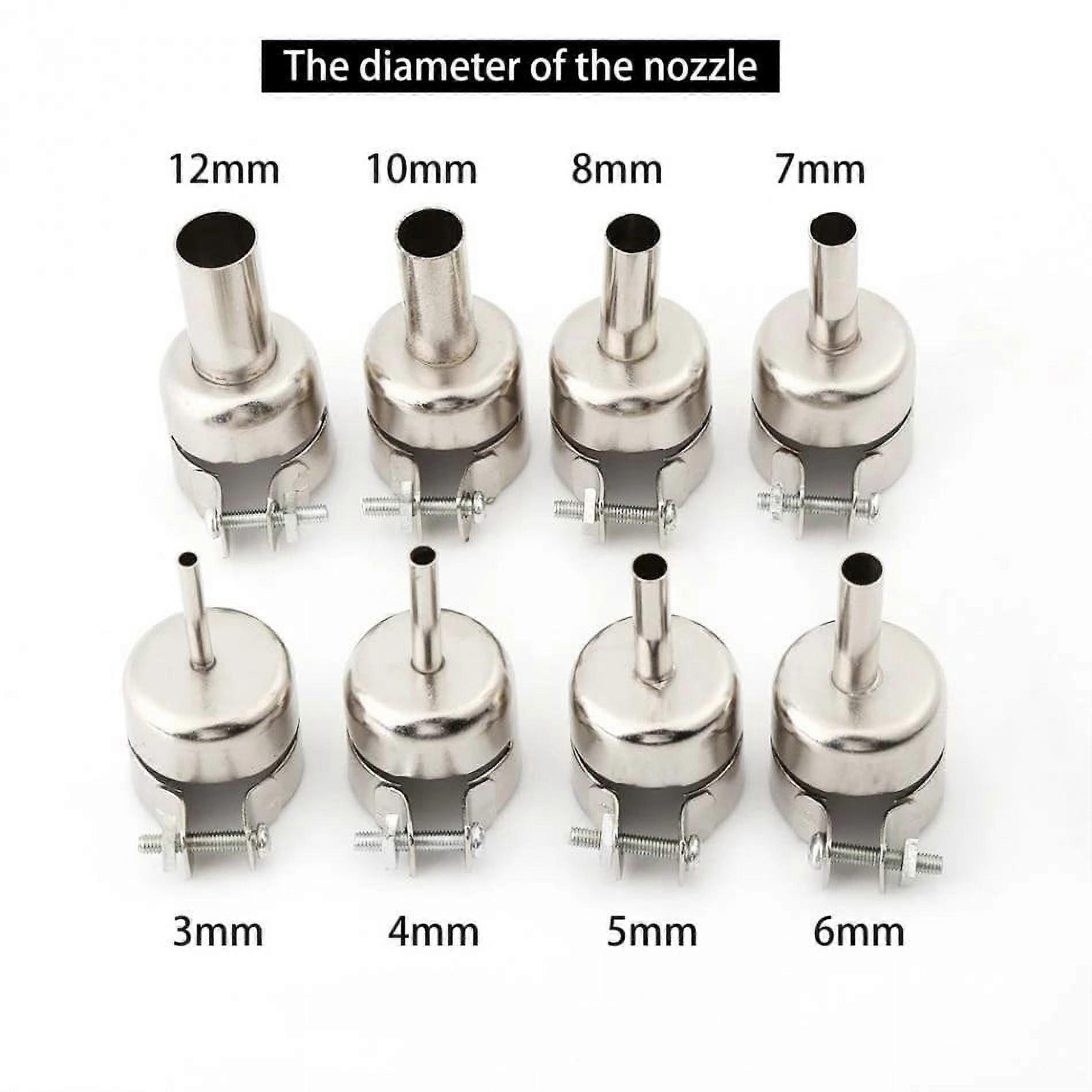 Features: *High quality Stainless steel, not easy to rust, durable. *There is a locking screw to lock the nozzle. Effectively avoid the hot air from flowing out from the gap between the nozzle and the steel pipe of the air outlet of the heat nozzle. *Strong versatility, suitable for a variety of hot air desoldering stations *Nozzle are compatible with 850 and 852D series, Aoyue 906, 968, 850, 6028, and many other systems *It doesn't fit to the Handheld HeatGun whose adapter Inlet diameter is 22mm. Specifications: *Type: Soldering station Hot Air Stations Nozzles *Material: Stainless steel *Color: Silver (As picture show) *Inner diameter of nozzle: 3mm, 4mm, 5mm, 6mm, 7mm, 8mm, 10mm, 12mm *Quantity: 1pc Package Included: 1*Welding Nozzle Note: 1.The real color of the item may be slightly different from the pictures shown on website caused by many factors such as brightness of your monitor and light brightness. 2. Please allow slight manual measurement deviation for the data. Made of high quality material, durable and practical to use. Perfect functions,give you a wonderful experience. We will ship it ASAP,when you place the order. If you have any questions, please feel free to contact us, we will solve it for you. Every customer can enjoy 30 days refund or replacement for Damaged/Quality Issues.