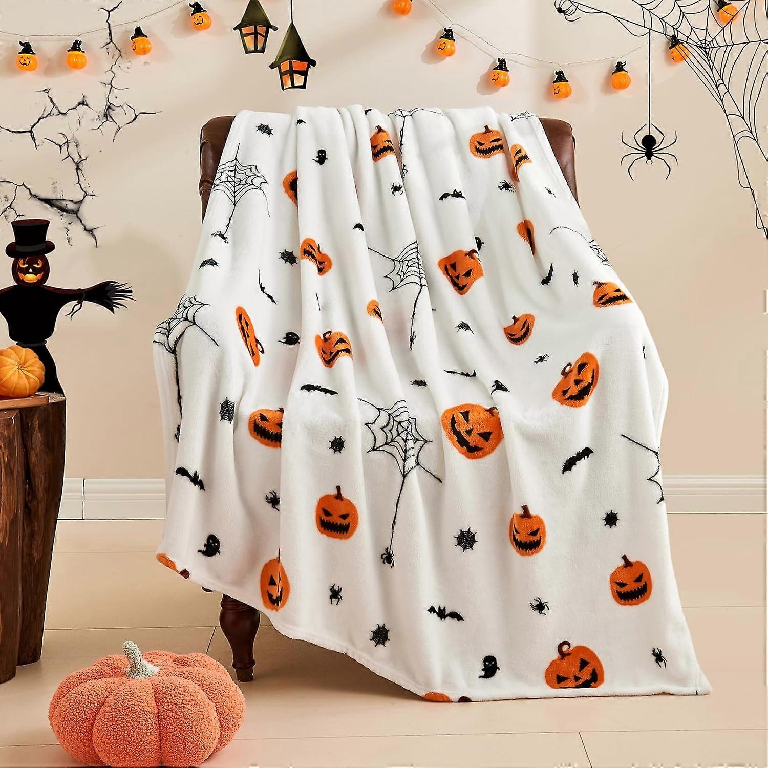 Soft and Cozy Halloween Blanket, Spooky Pumpkin Bat Spider Web Pattern White Blanket for Sofa Bed Home Decor Gifts 50"x60"