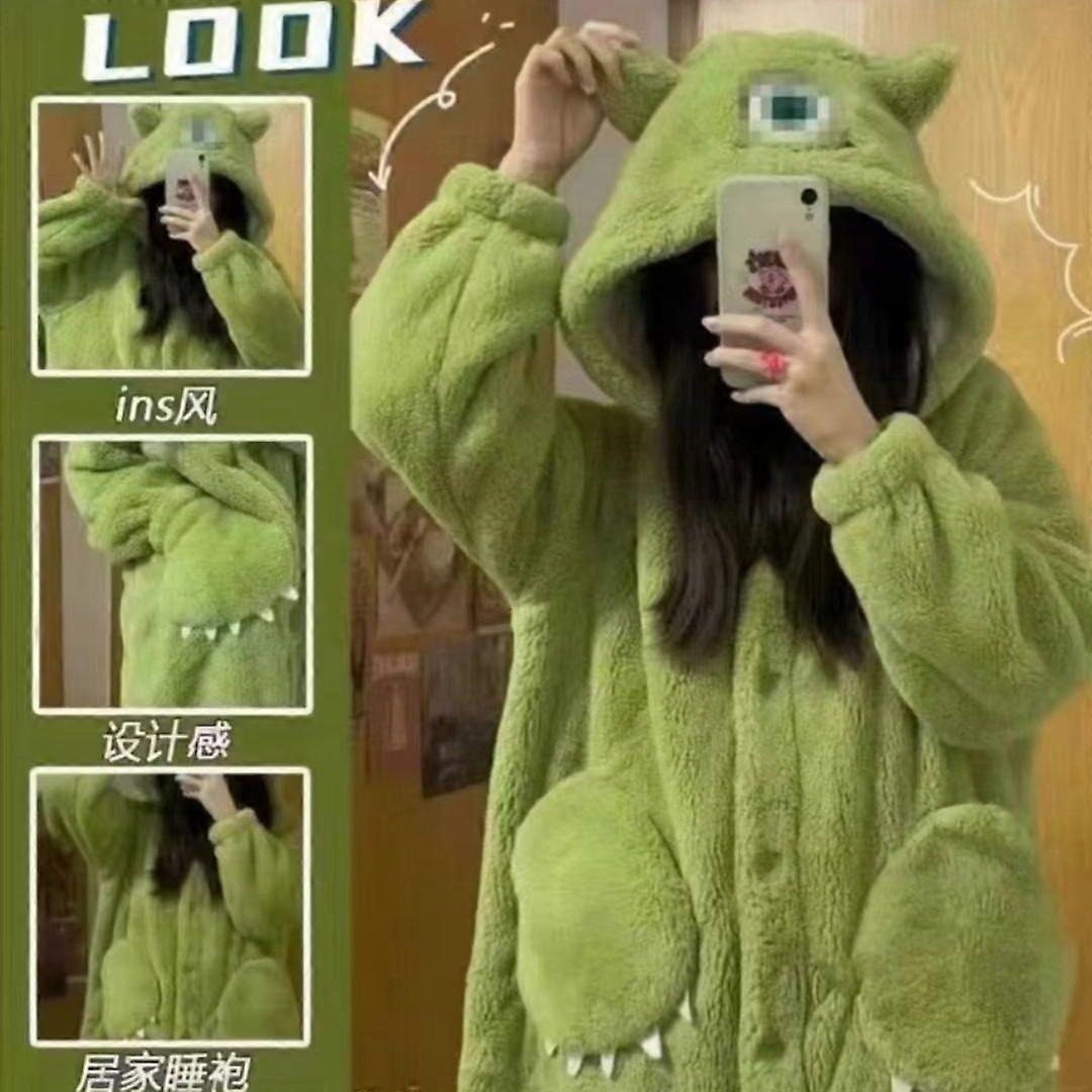 2023 Cute Big Eyes Hooded Coral Fleece Nightgown Thickened Mid-Length Couple Thickened Home Clothes