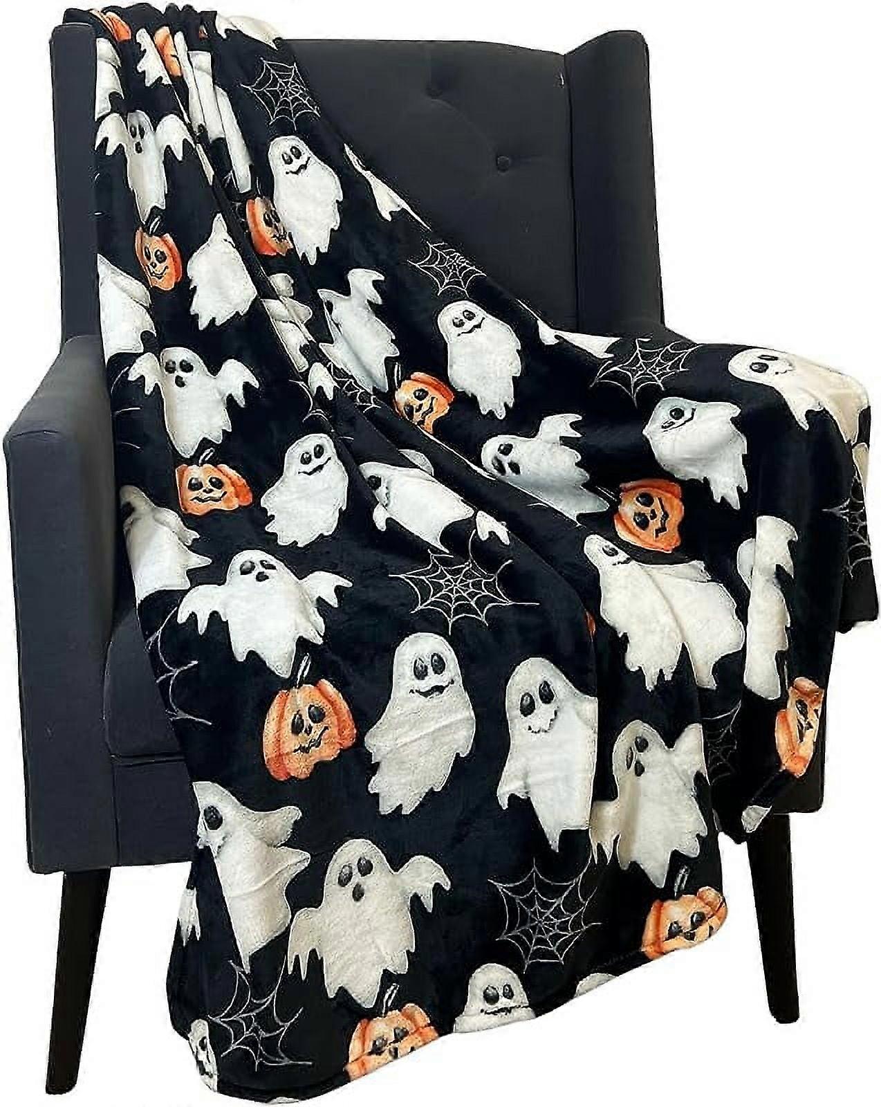 Hall-oween Throw Blanket: Jack O Lantern Pumpkins White Ghosts and Spiderwebs on Soft Black Velvet Fleece for Sofa, Couch, Chairs and Bed