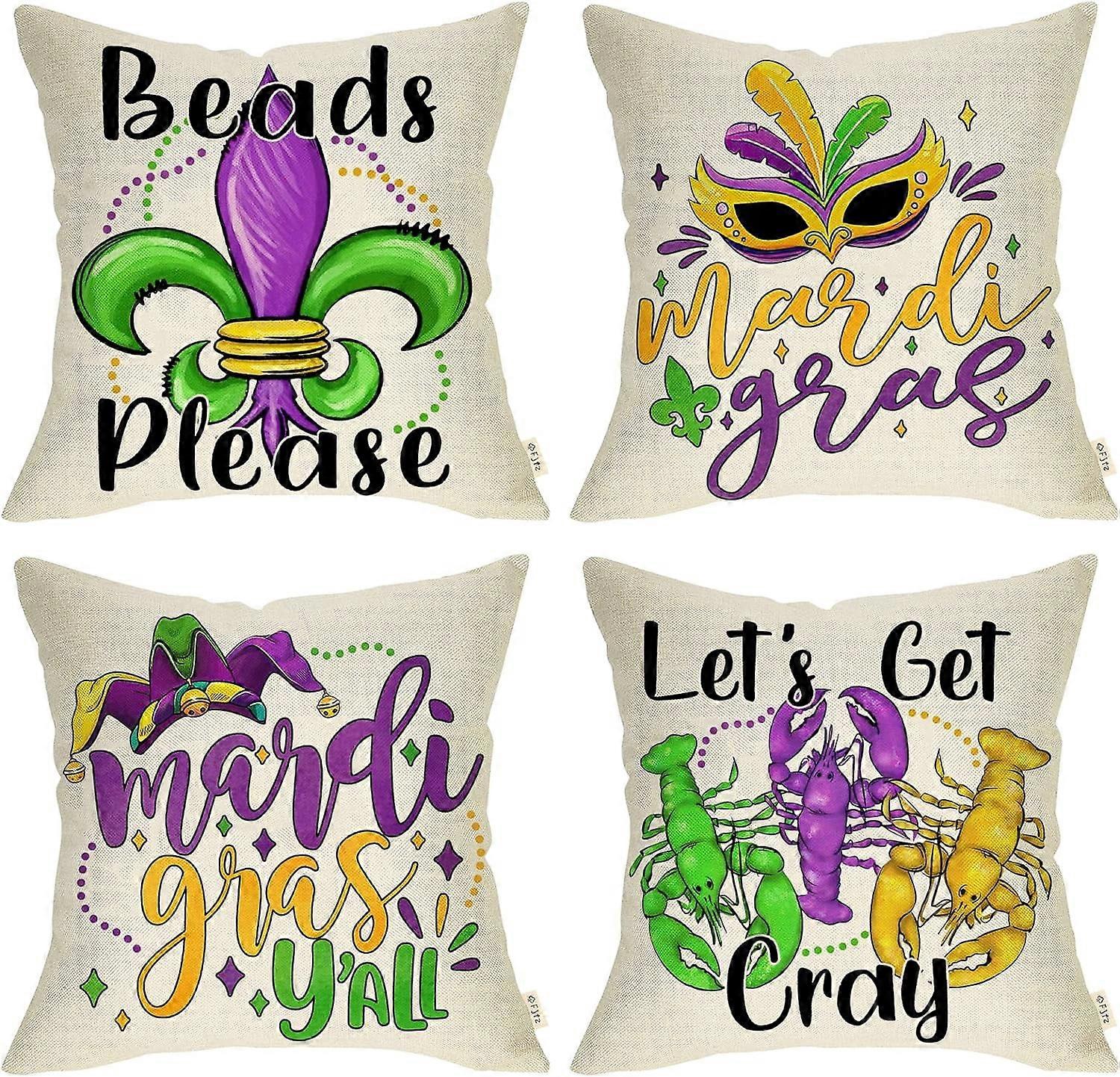 Cotton Linen Wide Application: Comes with 4 packs, the Mardi Gras Fleur de Lis throw pillow covers are popular home accessories for your soft pillows on sofa couch, sofa chair in indoor chairs, living rooms, bedroom, office, coffee shop and outdoor lawn, yard, patio, balcony, terrace. Our pillowcases can be used in the four seasons of spring, summer, fall, autumn and winter Special Pattern: These 18 x 18 inches decorative Mardi Gras holiday seasonal pillow covers are single-sided printed with pattern. The spring seasonal pillowcases are printed with eye mask,cray,hat. Besides, our pillow covers have words Beads Please and “Let’s Get Cray”written on them Holiday Gift: The Mardi Gras Fleur de Lis pillow covers are very suitable for holiday gifts for friends and family. Similarly, they are also suitable for someone you love. Our pillow covers are not only gifts, but also warm decorations, unique home decors Durable Material: The couch pillow cover is made of 100% cotton linen fabric, which is a sturdy and machine washable canvas material. Even pets and kids afflicting it, it will maintain their integrity and looks Easy To Move: Equipped with hidden zipper closure, barely noticeable, the pillow case allows you zip up and down smoothly. After stuffing, you may lightly hit pillow against your knees to ensure pillow insert(Not Included) spread evenly