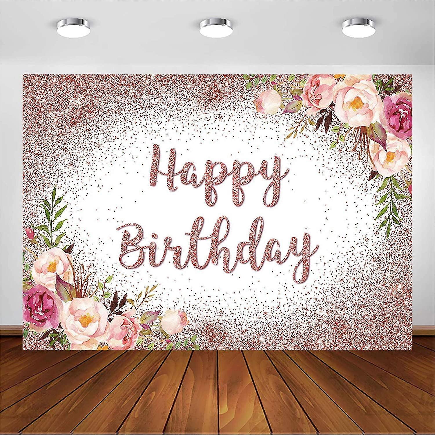 Rose Gold Birthday Backdrop 7x5ft, Blush Pink Floral Glitter Confetti for Girls Women Happy Bday Party Photoshoot Banner Decoration