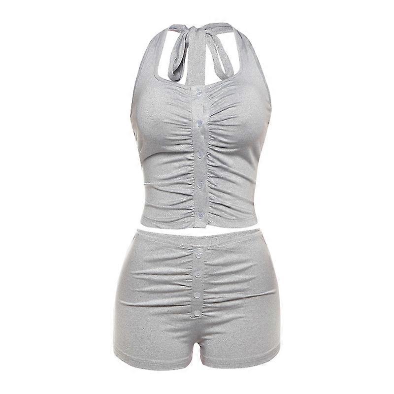 Summer Women's Sexy Halter Neck Tie-Waist Pleated Tank Top and Shorts Set