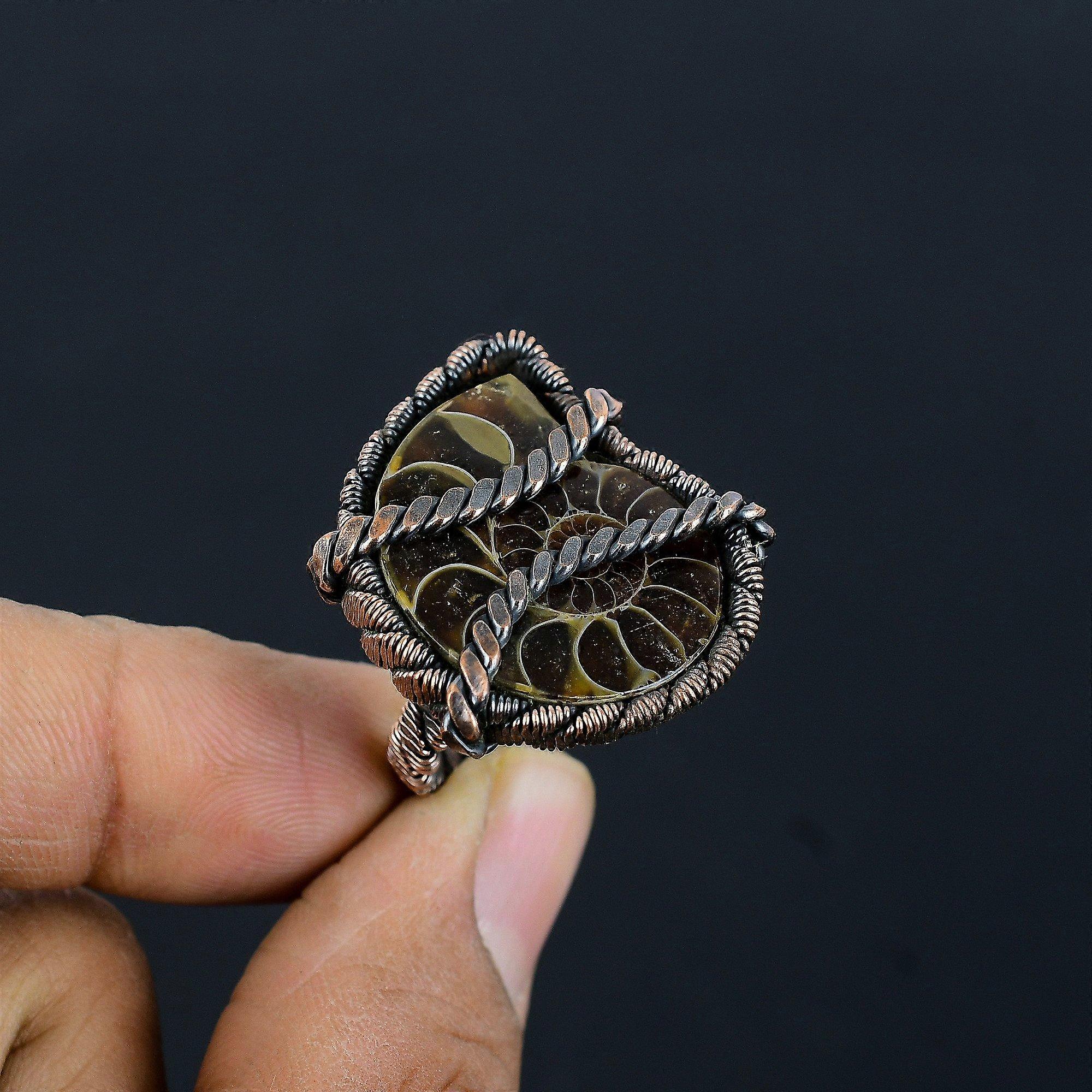 Ammonite Fossil Gemstone Copper Wire Wrapped Handmade Jewelry Ring For Gif