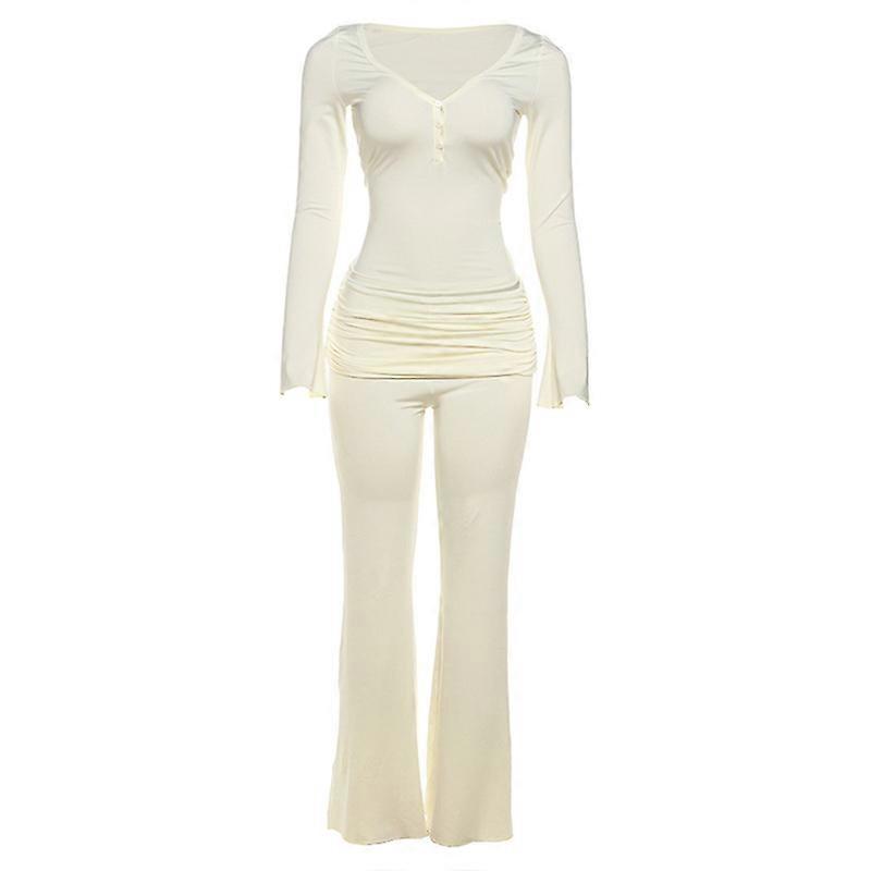Women's Autumn Solid Color Slim Fit V-Neck Button-Up Long Sleeve T-Shirt and High Waist Flared Trousers Suit