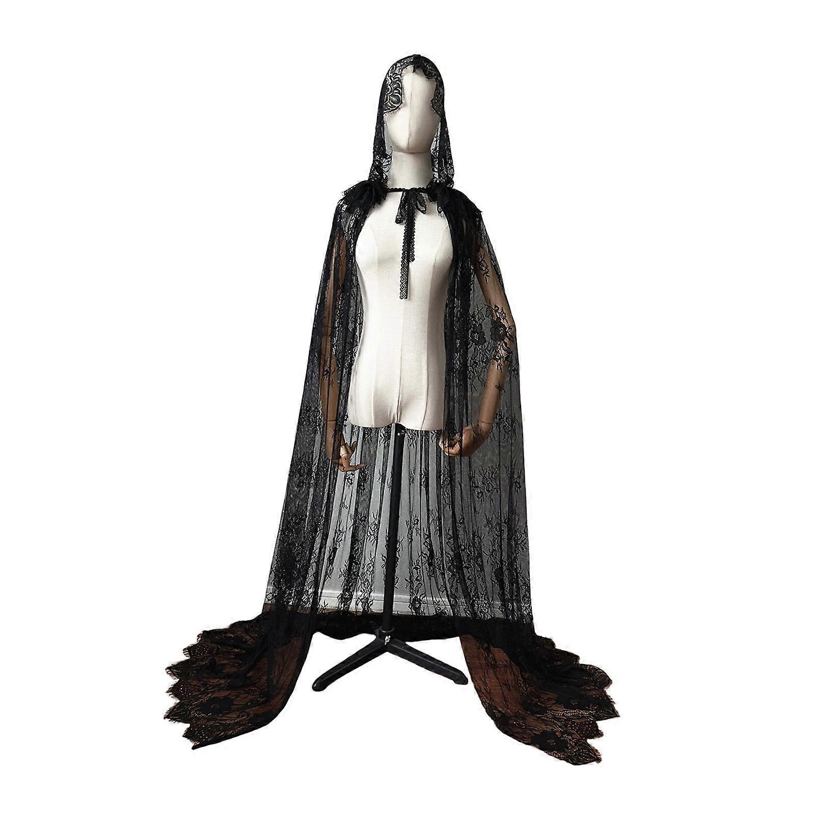 Women Lace Hooded Cloak Long Sheer Cloak Fancy Dress Halloween Wedding Eve Cloak
