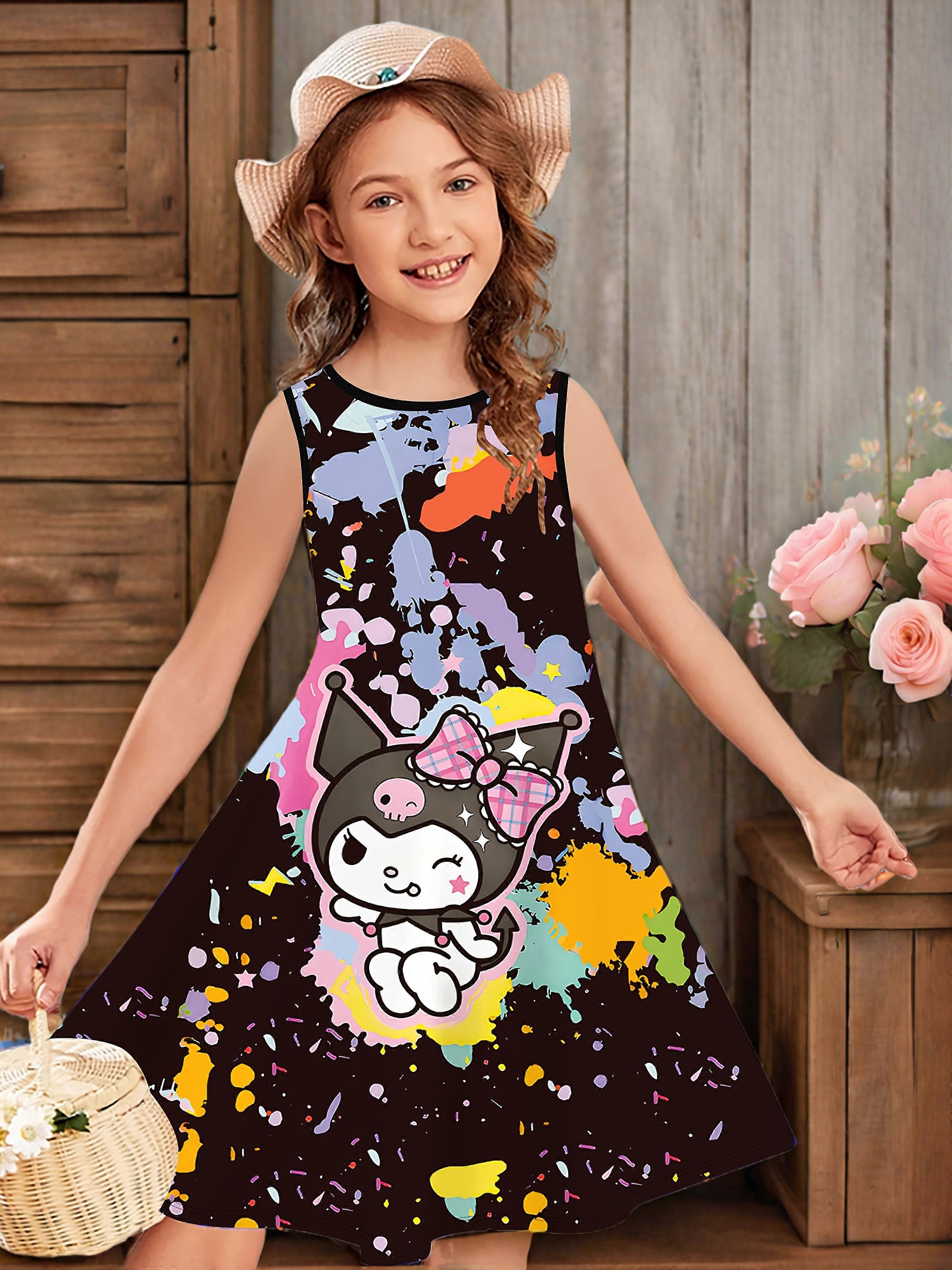 Summer New Style Cute And Casual Fashionable Girls' 3d Printed Round-Neck Pullover Dress With Kuromi Pattern