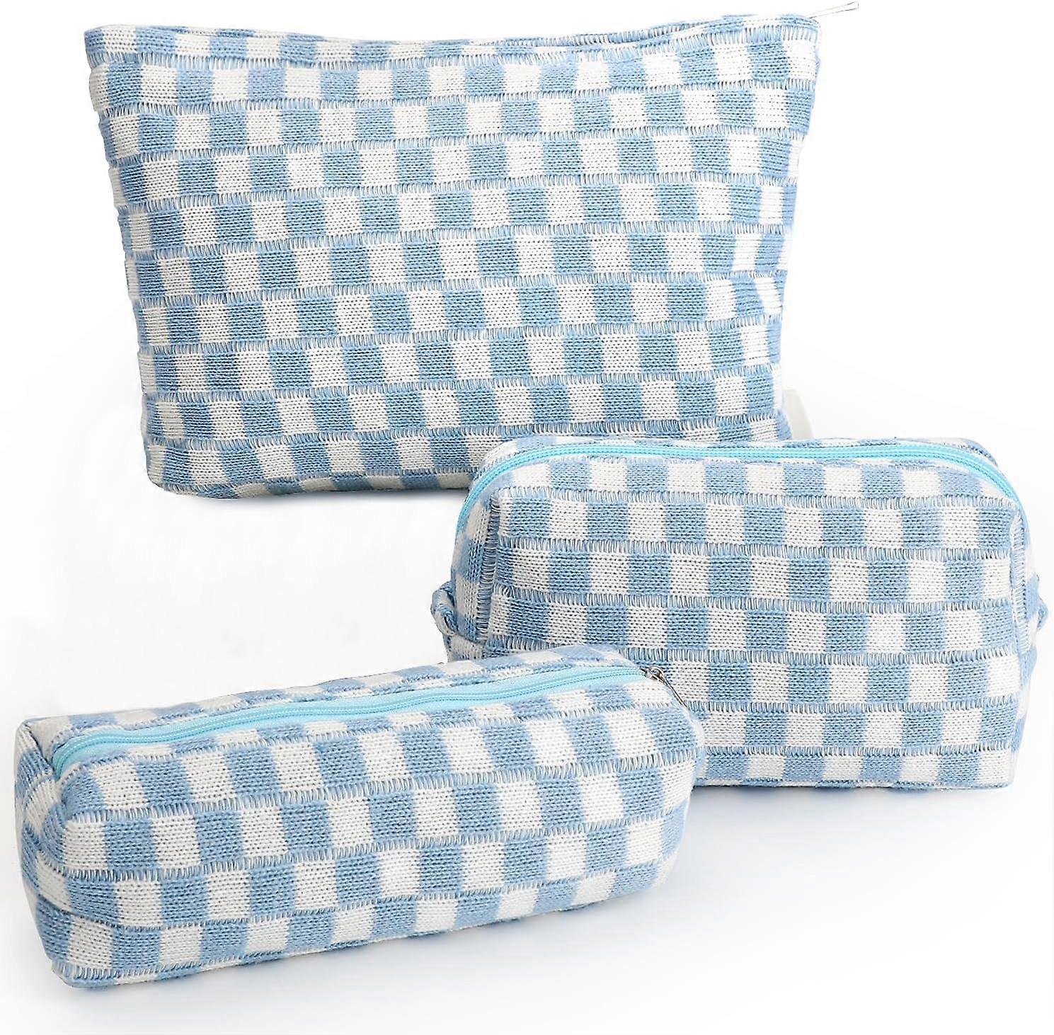 Pack Makeup Bags for Girls and Women, Plaid Travel Organizer, Bathroom Toiletry Bag, Large Capacity Storage Pouch (Blue-White)